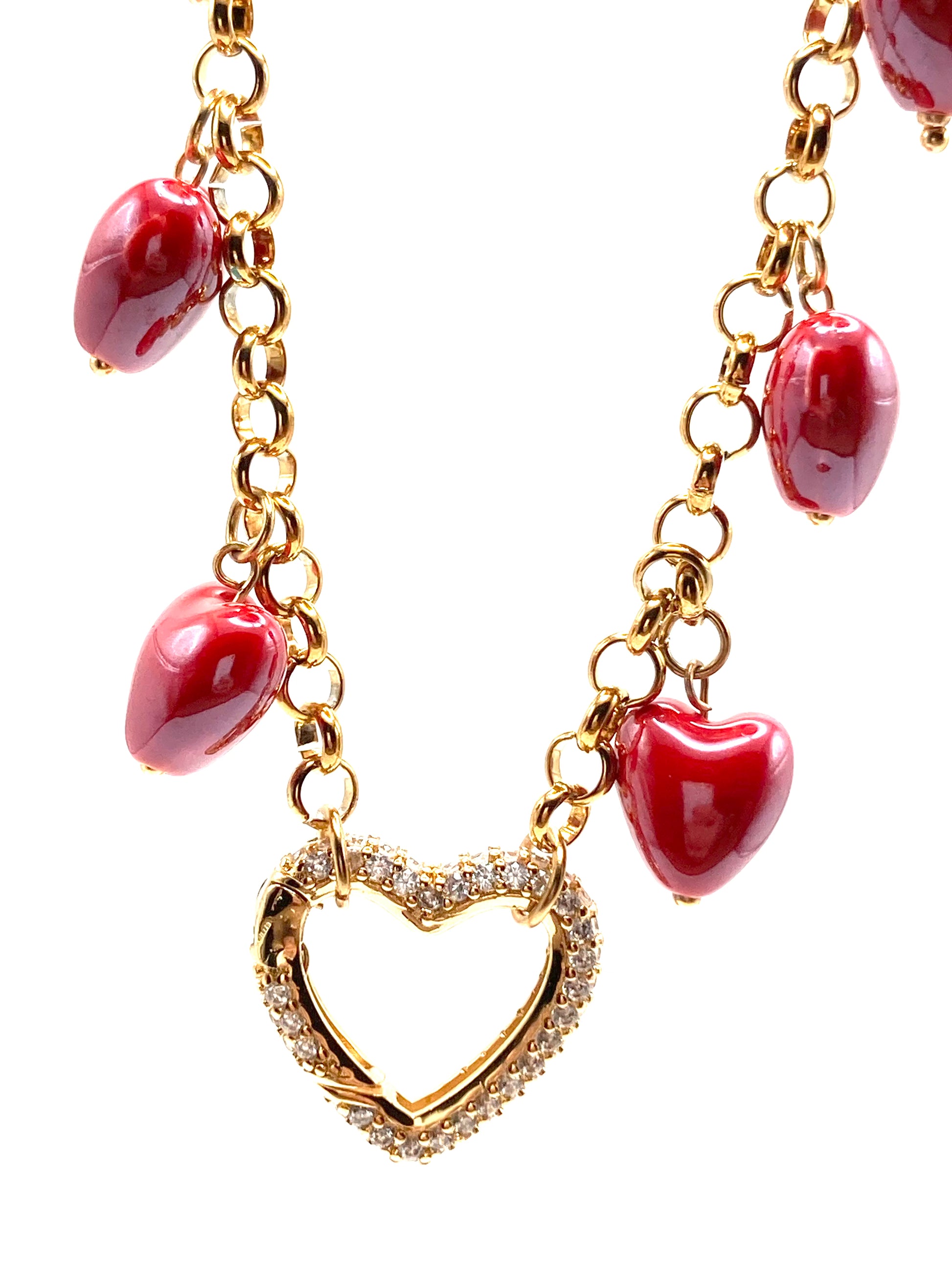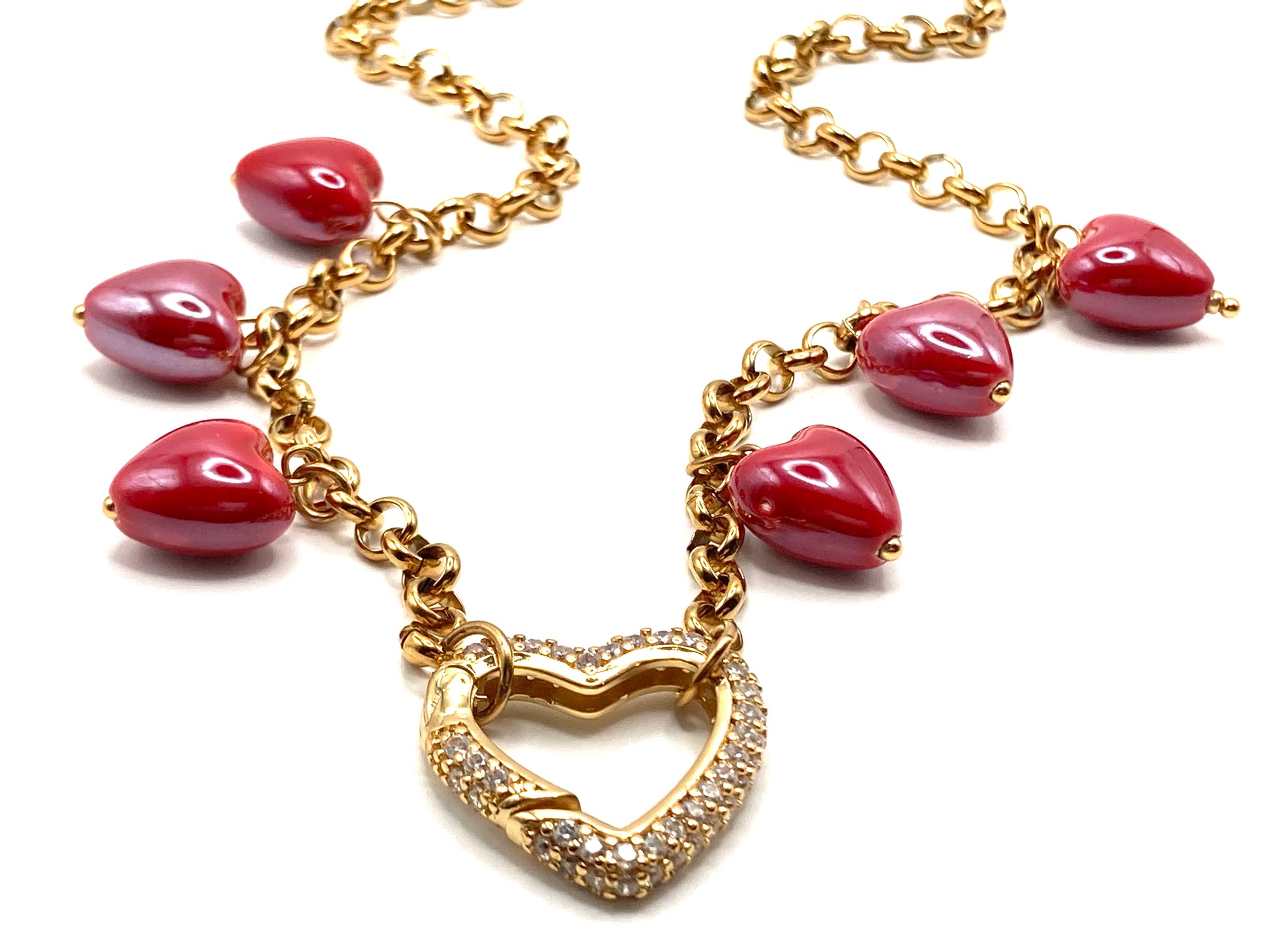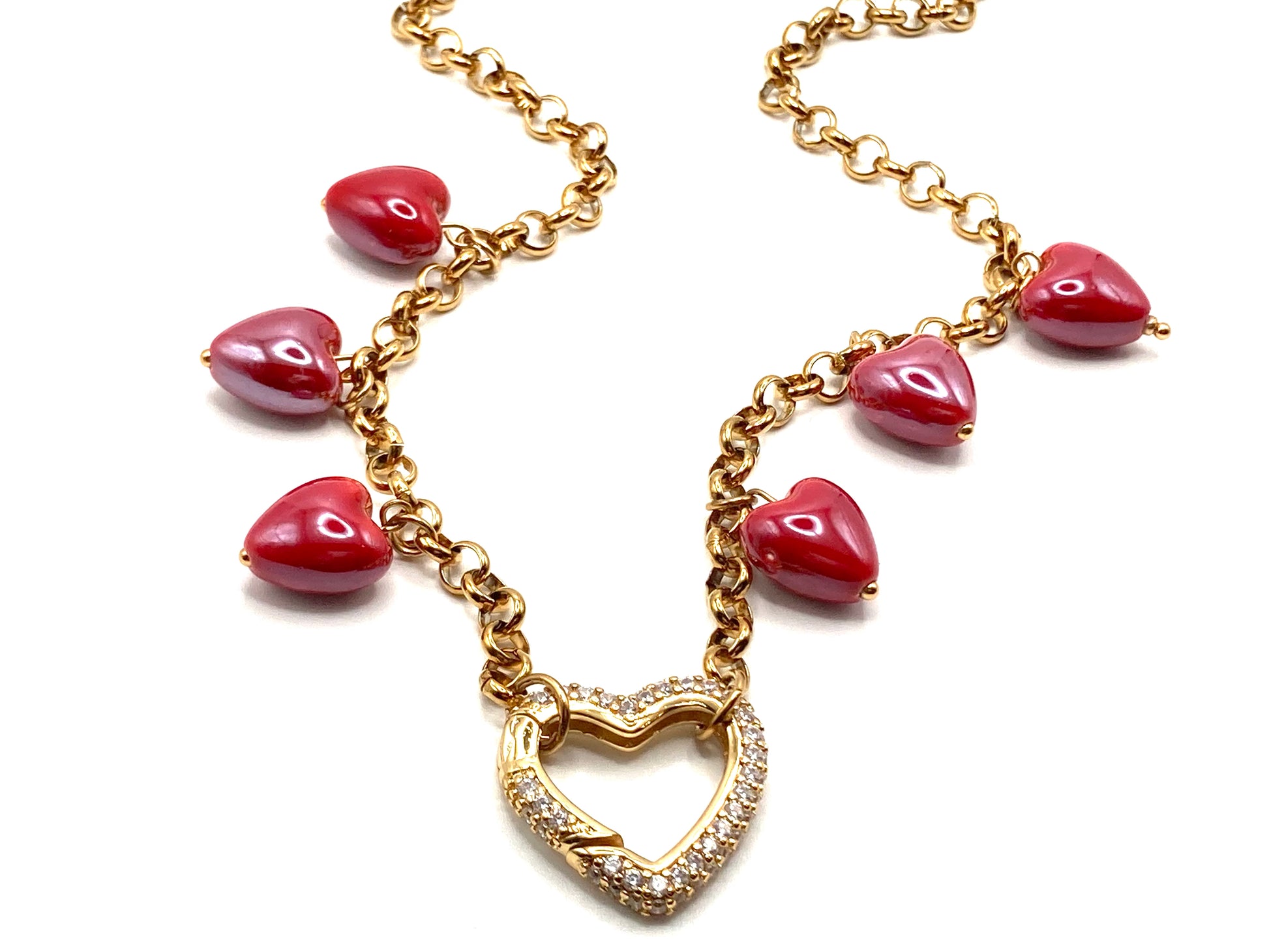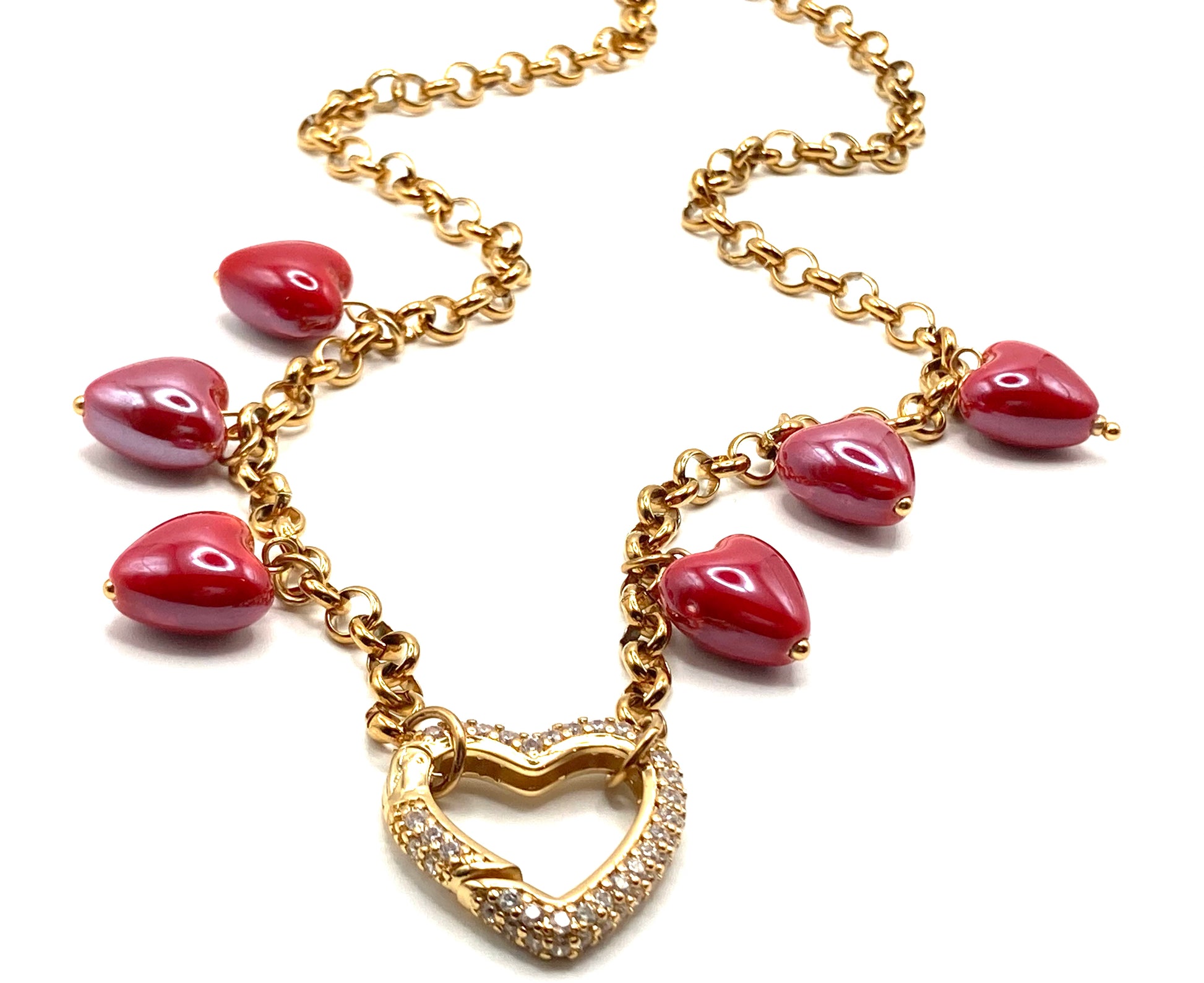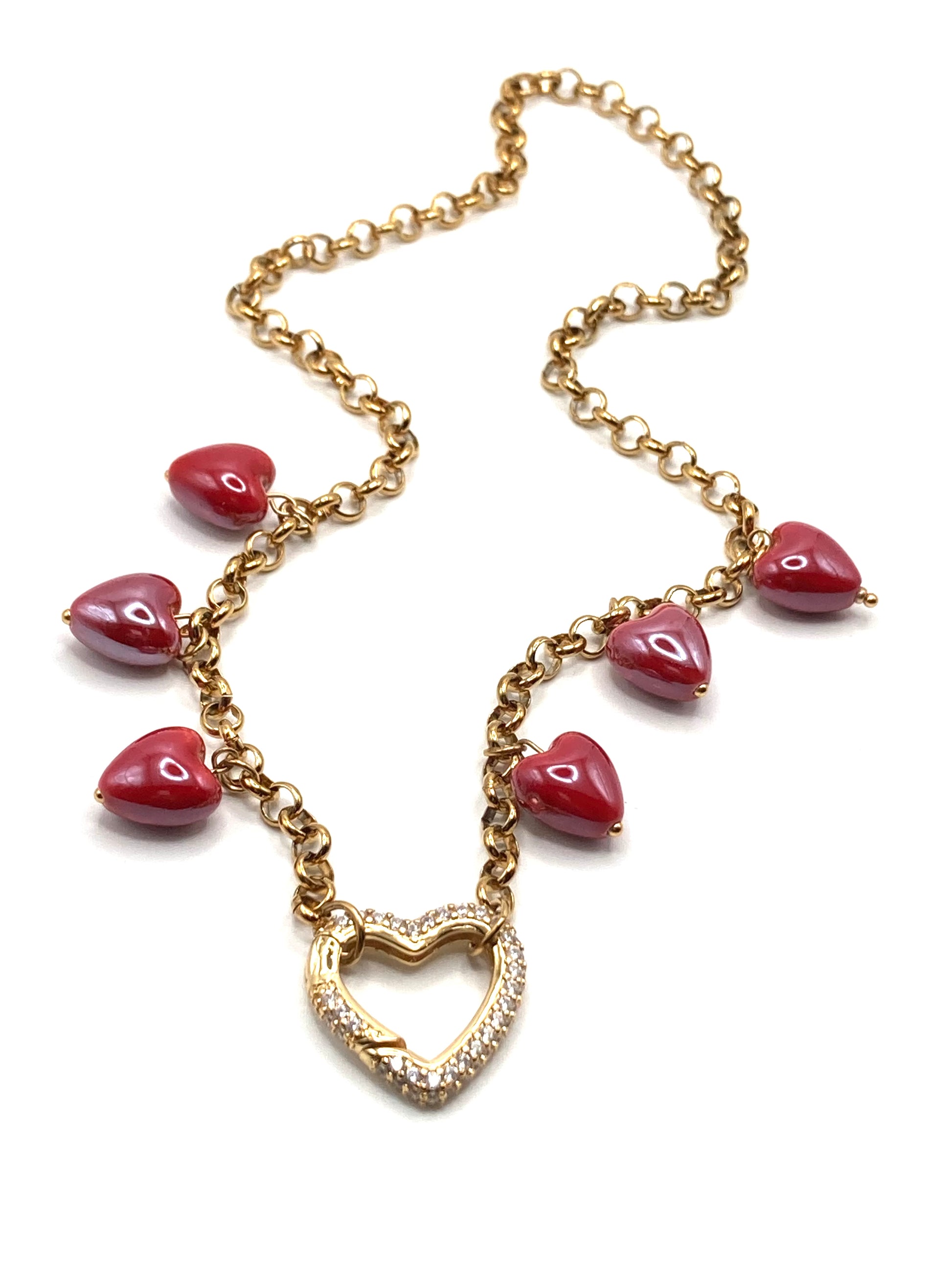 Collier en acier avec chaîne en forme de cœur creux de 4 mm, chaîne chapelet de 3 mm, connecteur central en forme de cœur creux, breloque en forme d'ange de 25 x 15 mm avec hématite et perle de verre.