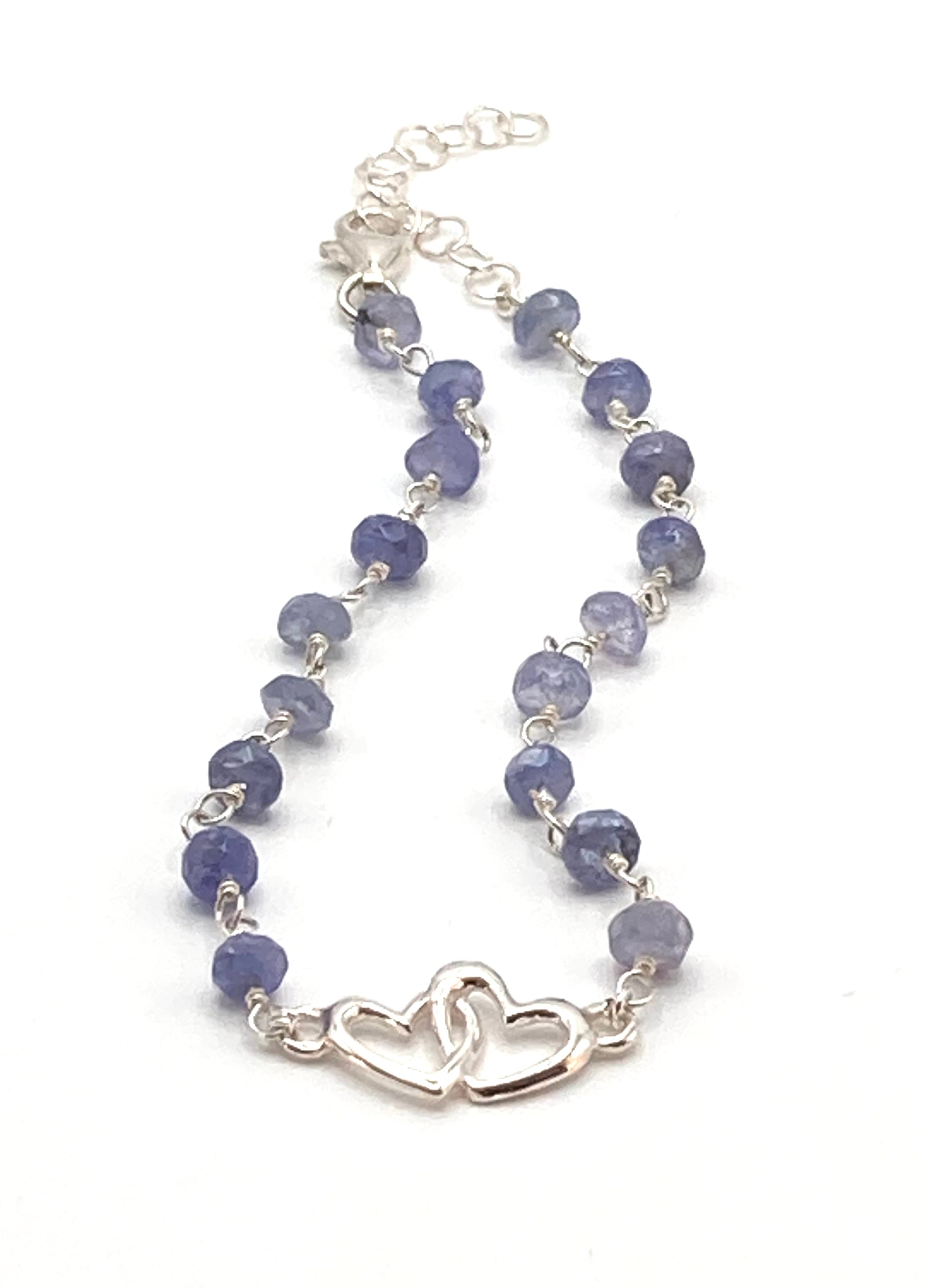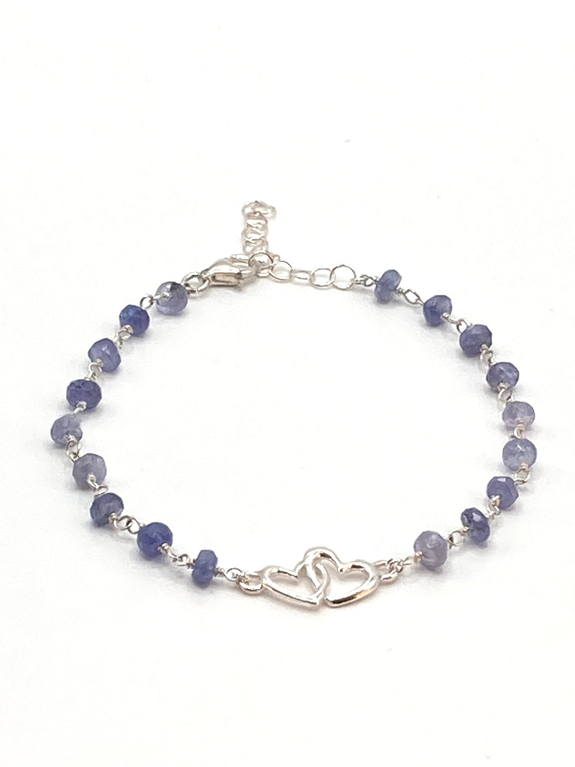 Bracciale Rosario in Argento 925, con pietra naturale, connettore Cuori Intrecciati ca. 15mm, misura regolabile con estensione