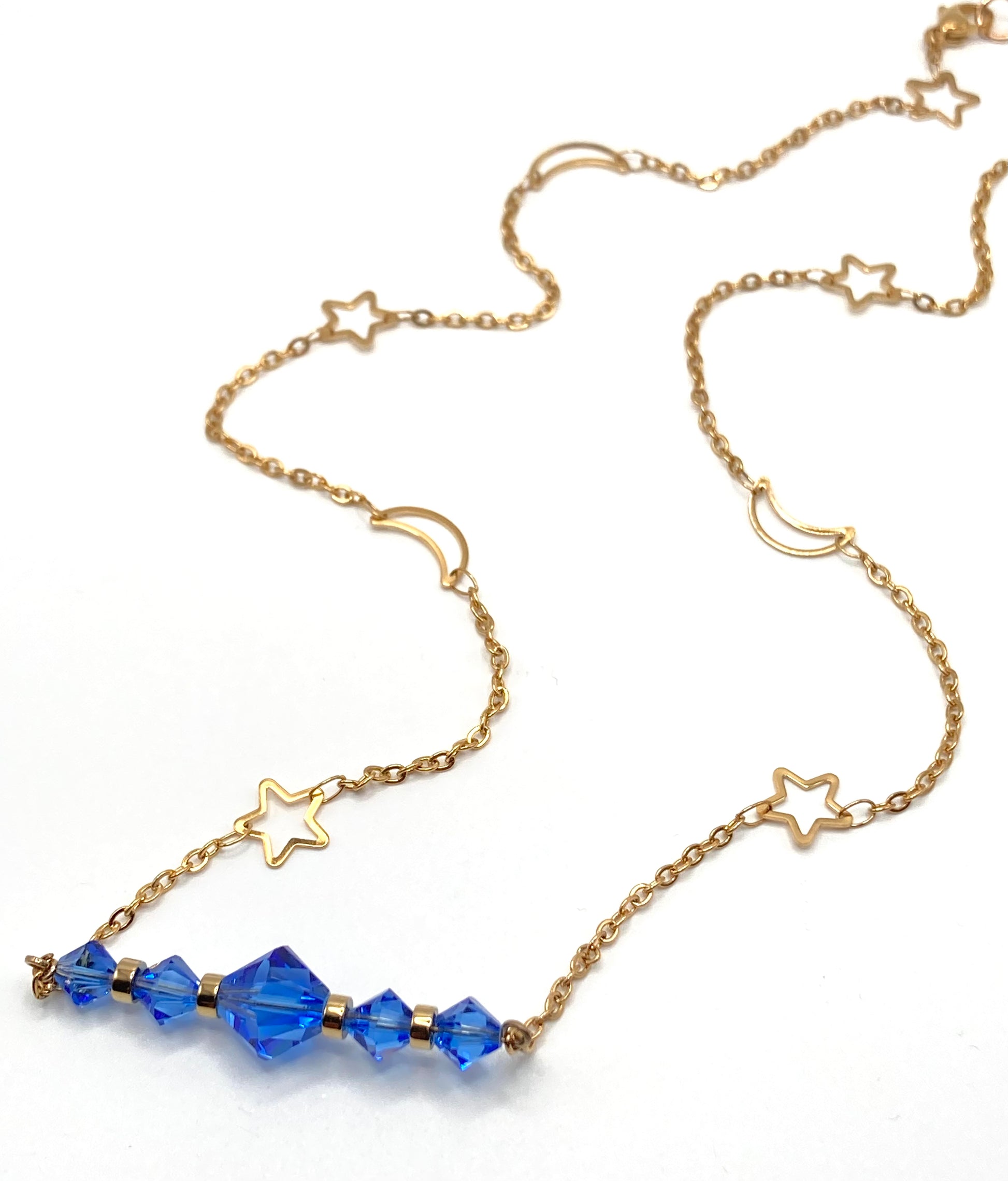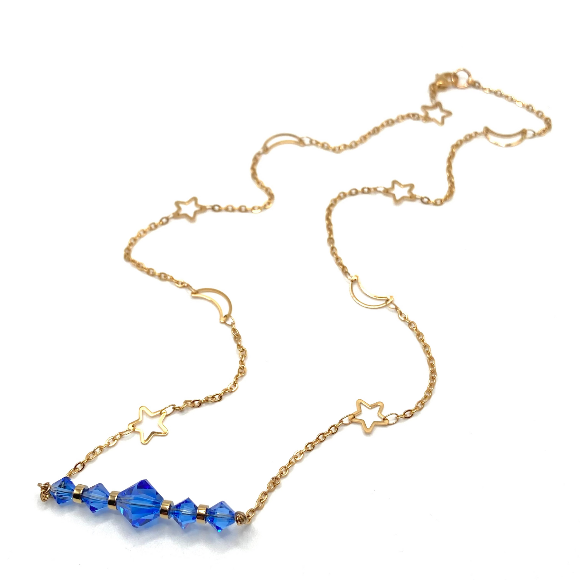 Collana in acciaio con catena forzatina alternata a stelle e lune ogni 4cm, cristalli bicono centrali, 4 da 6mm e 1 centrale da 10mm
