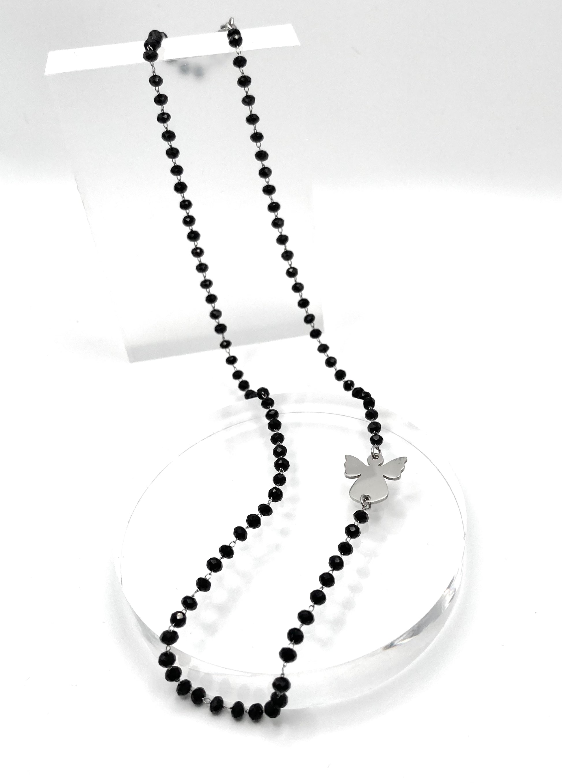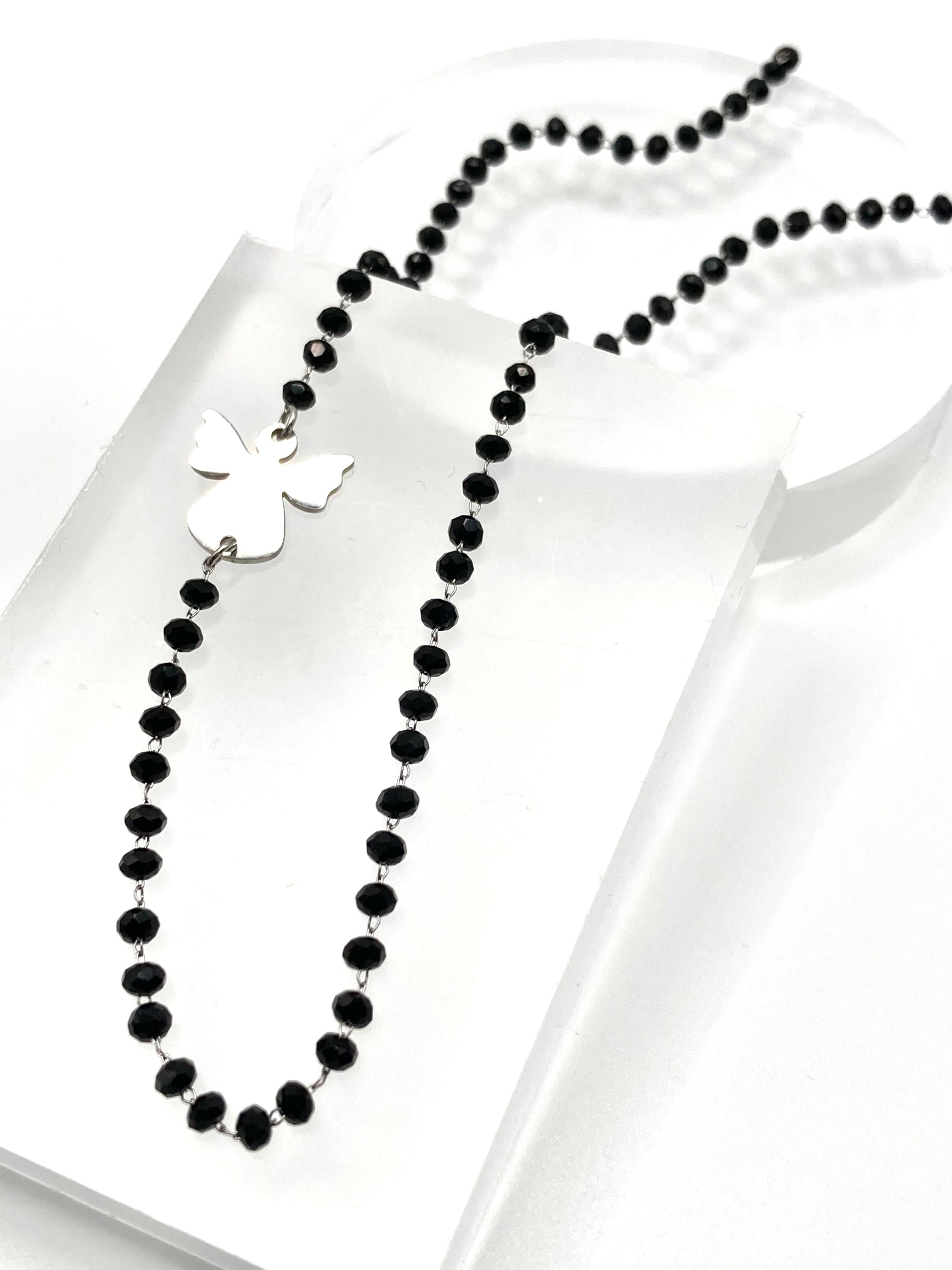 Collana con catena rosario con cristalli neri 2mm, connettore laterale a forma di angelo dim.15x15mm