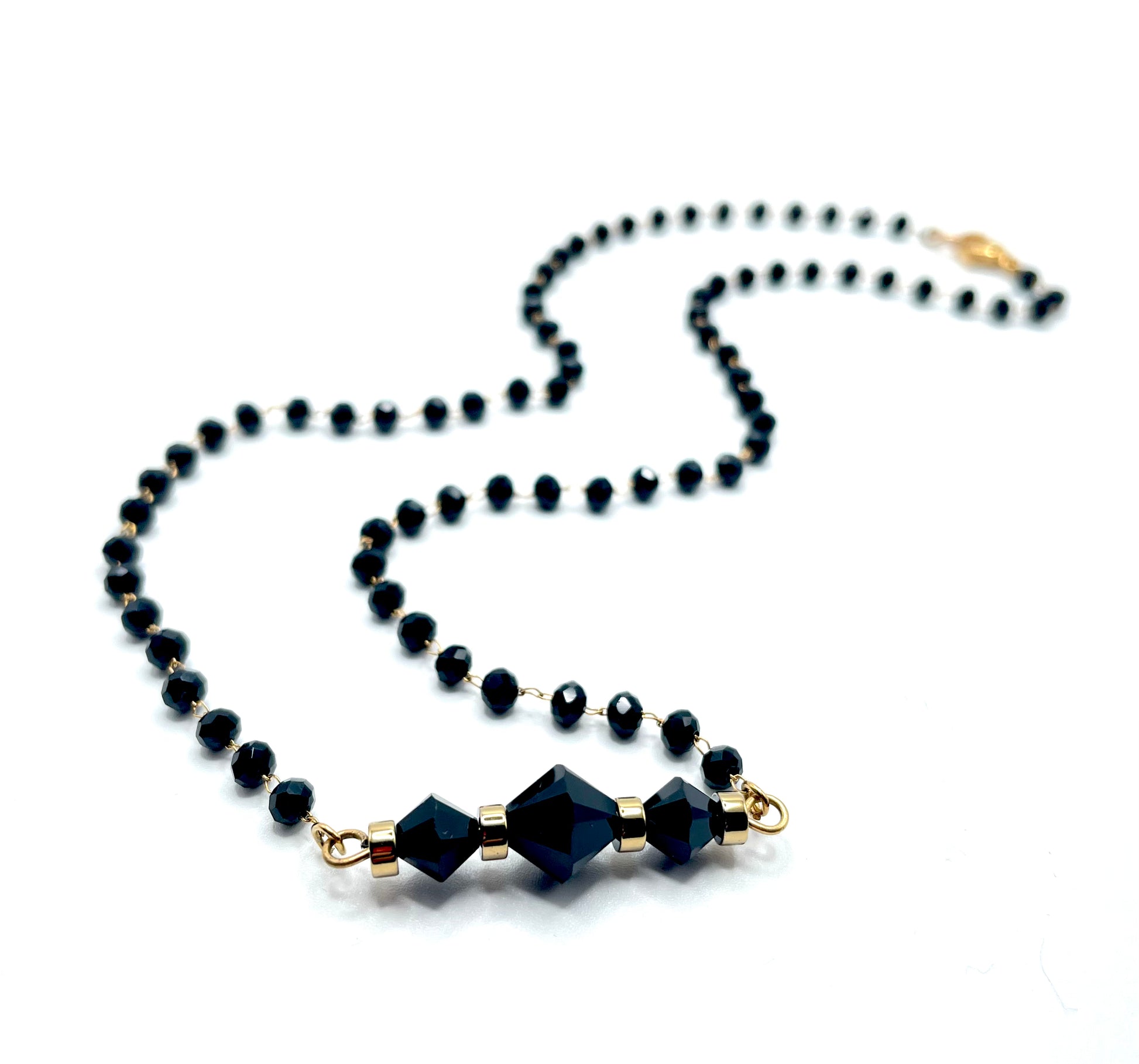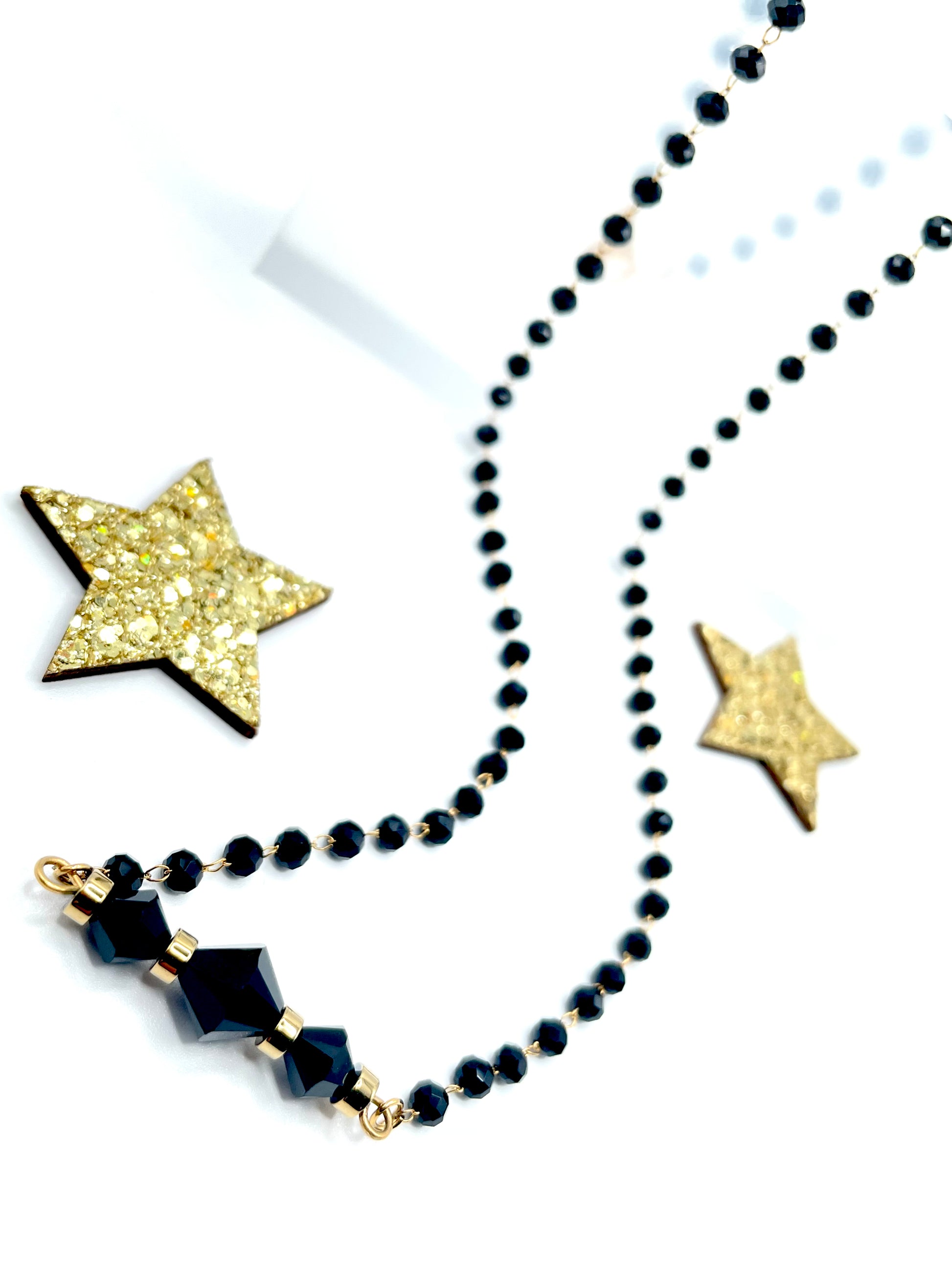 Collana in acciaio con catena rosario cristalli da 2.5mm, cristalli bicono centrali, 2 da 6mm e 1 da 10mm, distanziati da rondelle in ematite dorata da 6mm