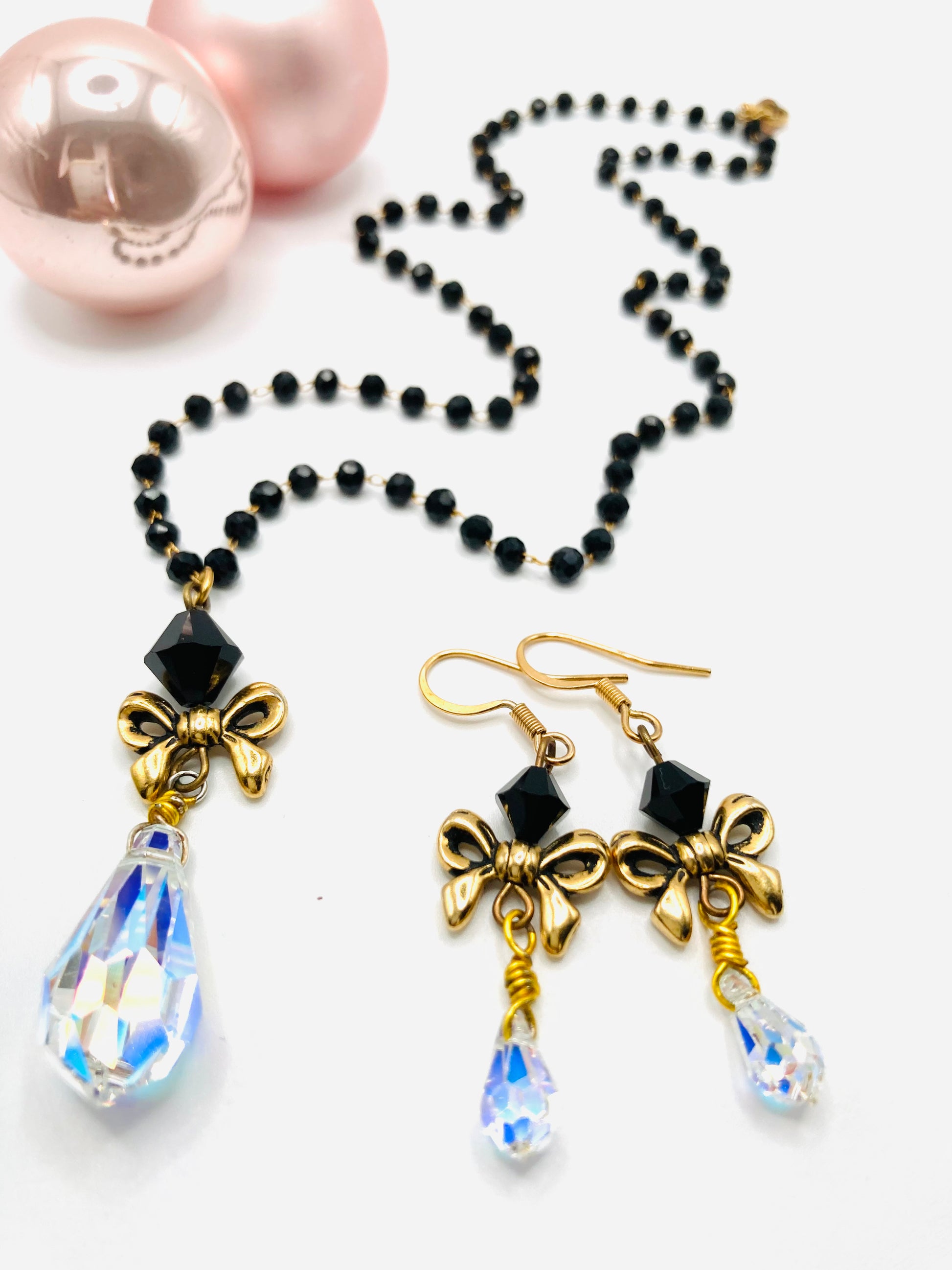 Set composto da : 1 Collana con catena rosario con cristalli da 2.5mm, charm centrale con cristallo bicono 8mm e goccia in cristallo AB 20mm, distanziati da una perlina a forma di fiocco, 1 paio di orecchini con monachella e pendente con cristallo bicono 6mm, goccia in cristallo AB 10mm, distanziati da una perlina forma di fiocco.