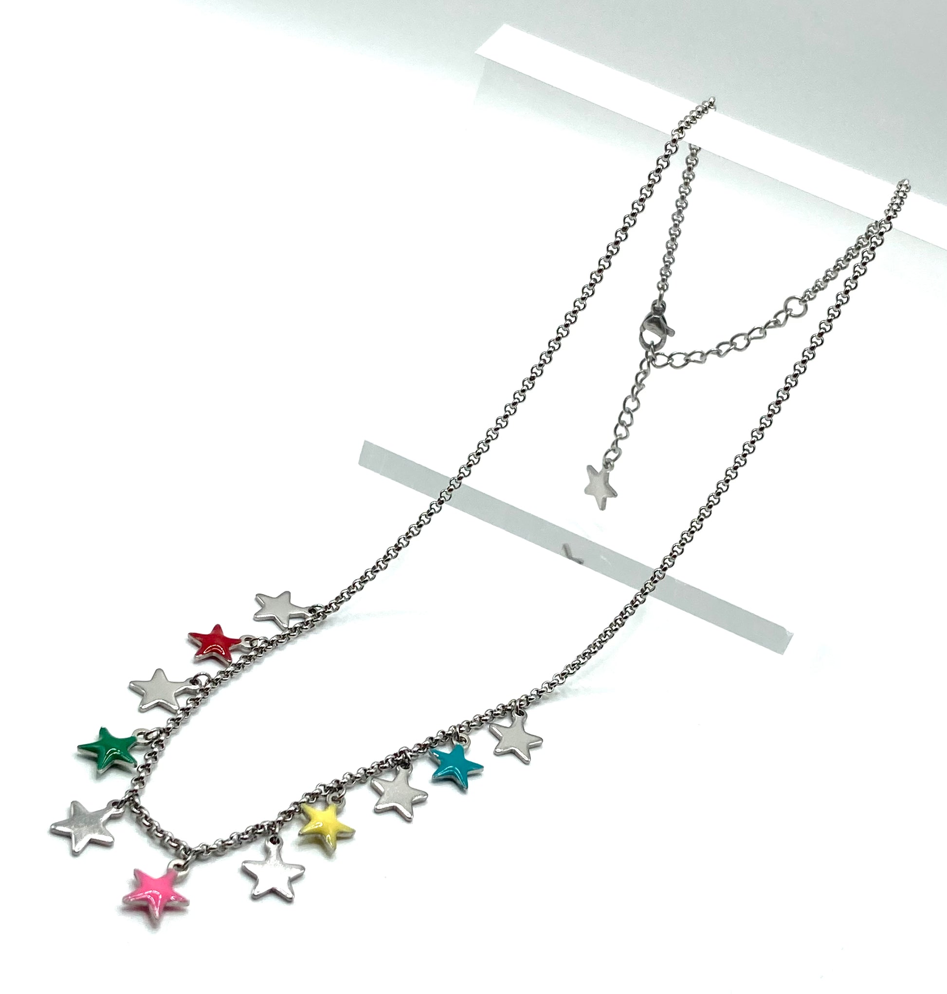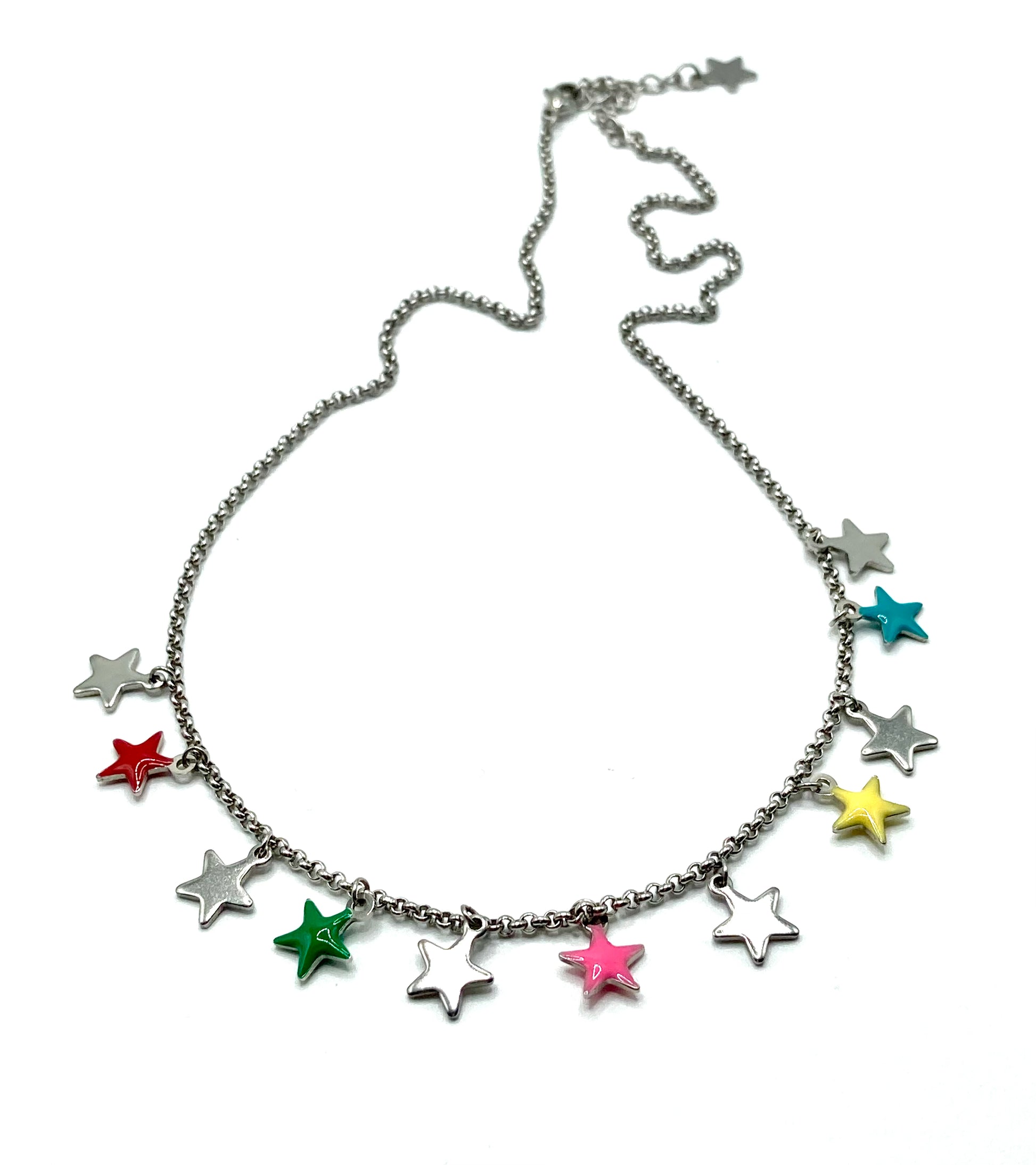Collana in acciaio catena rolo' con charms a forma di stelline, 5 smaltate e 5 in acciaio da 8mm, misura regolabile con estensione