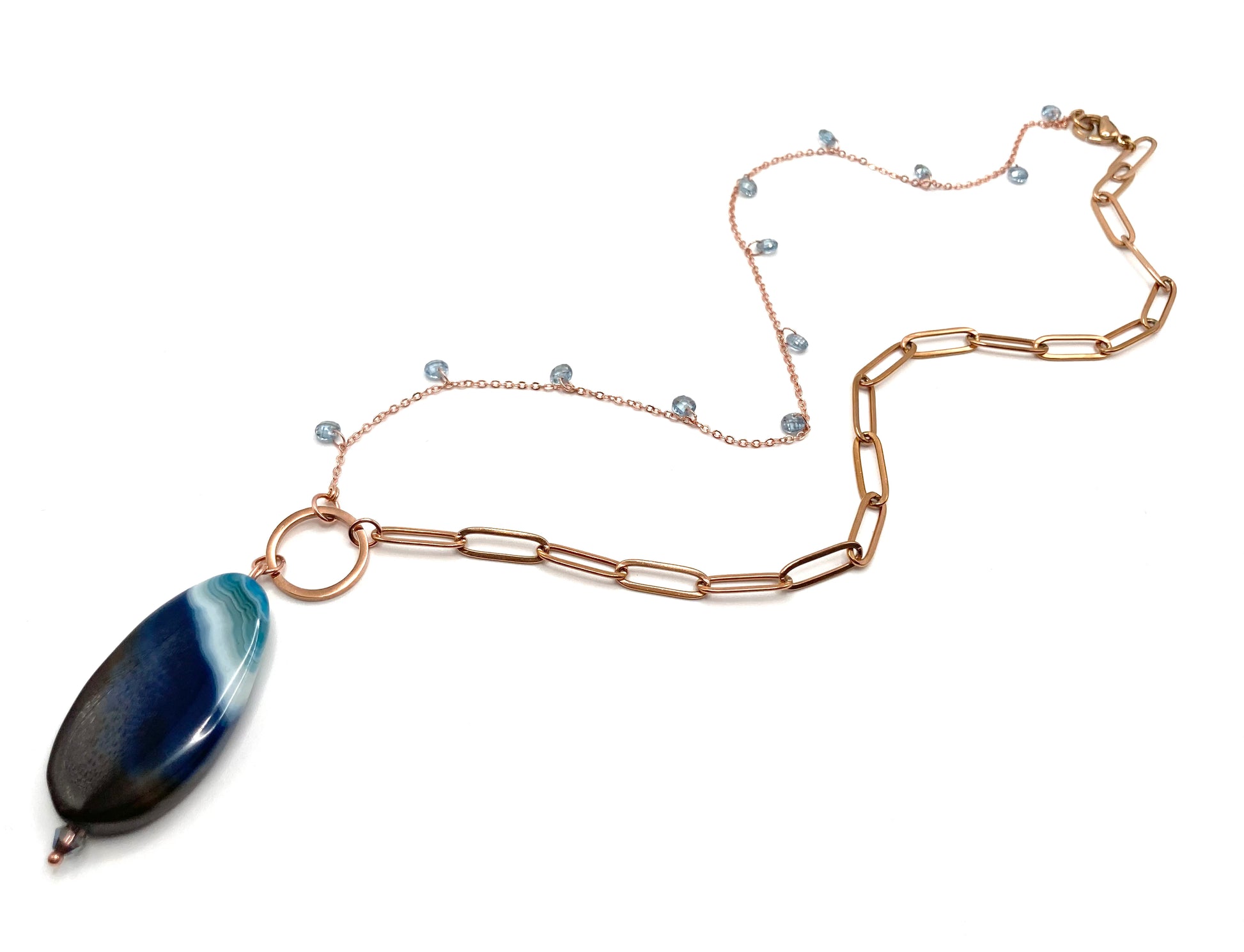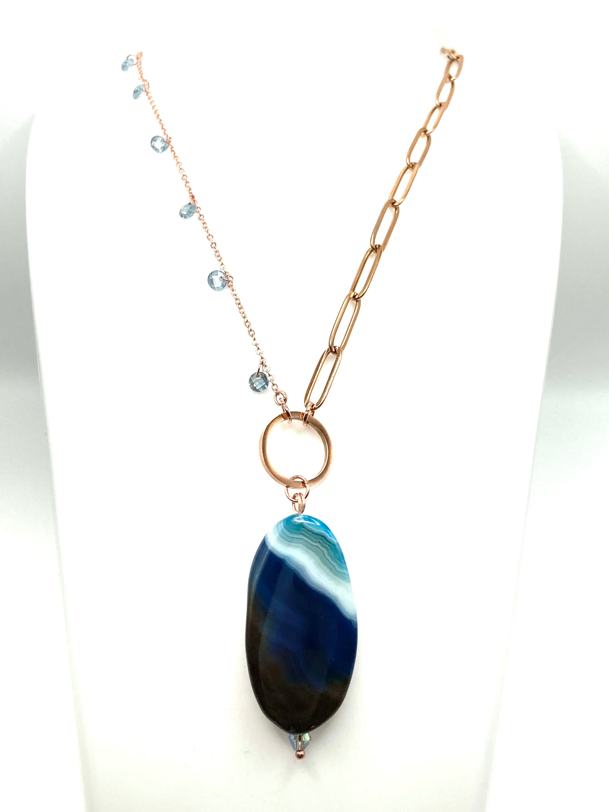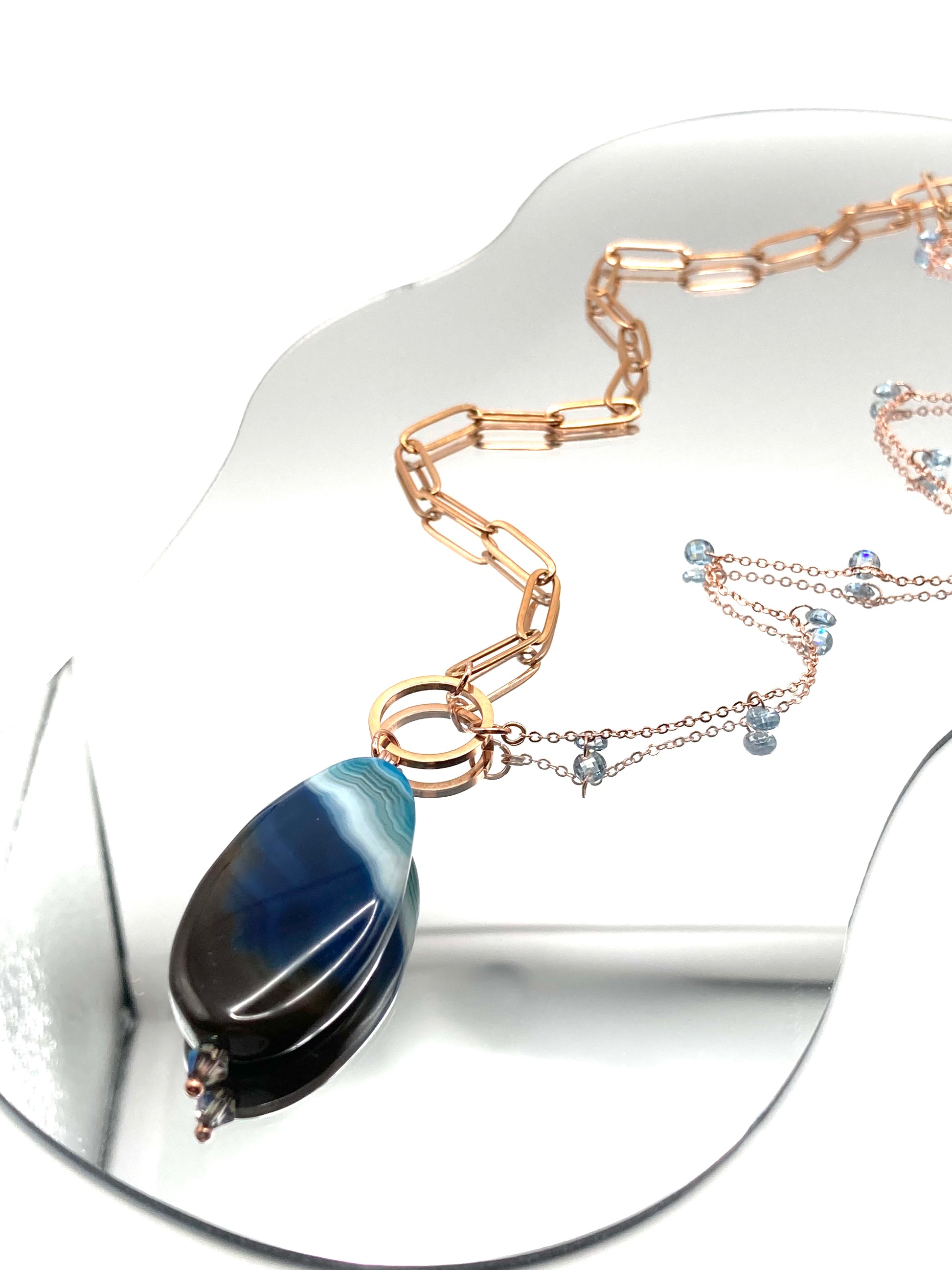 Collana in acciaio rosa con zirconi taglio brillante 4mm e in acciaio rosa maglia rettangolare piatta 14x4mm, unite da un connettore a cerchio vuoto di ca.15mm, ciondolo in pietra dura a forma ovale di circa 4x2cm