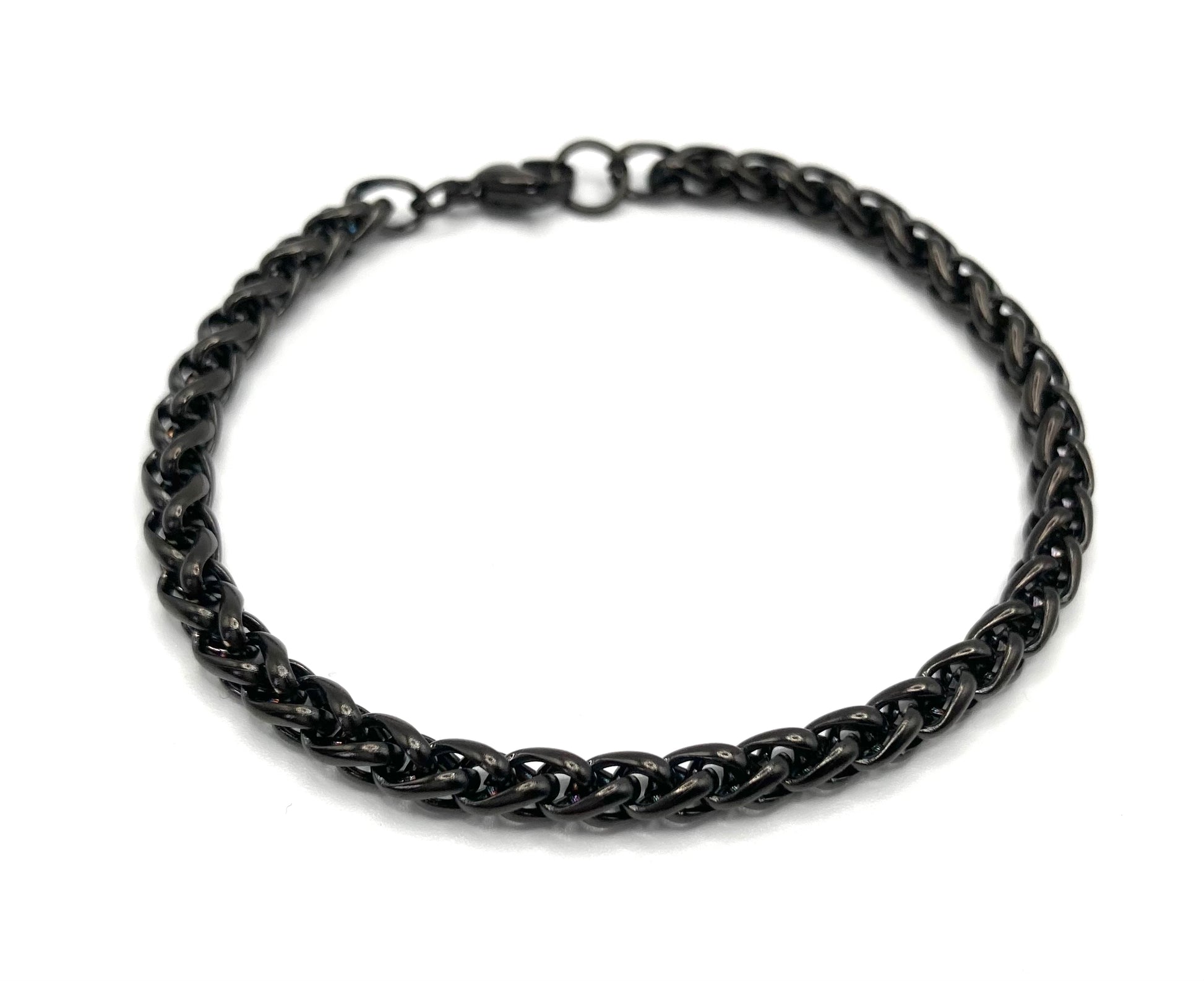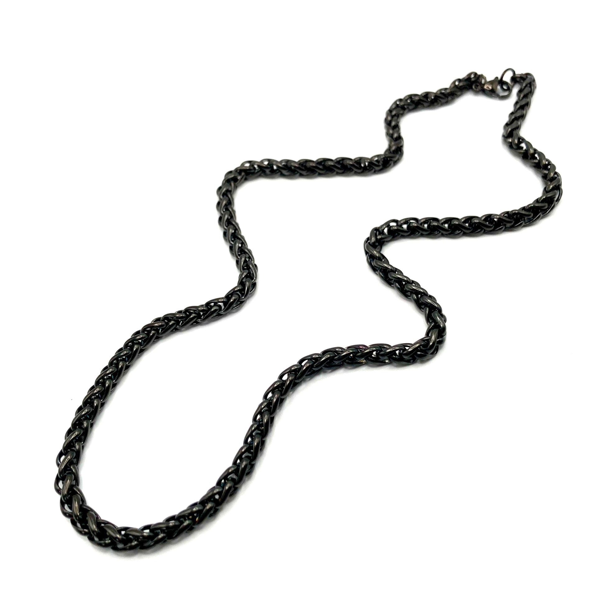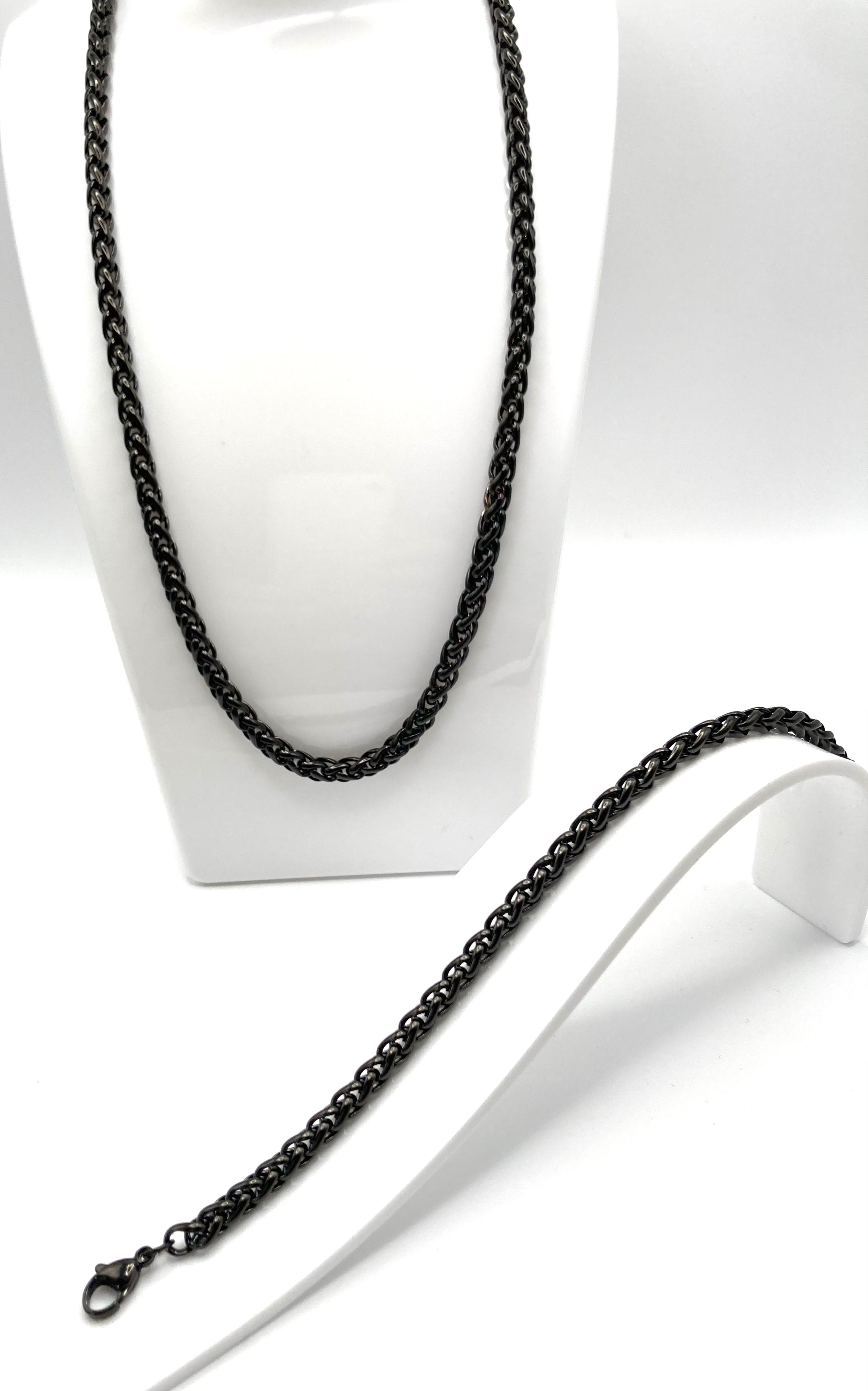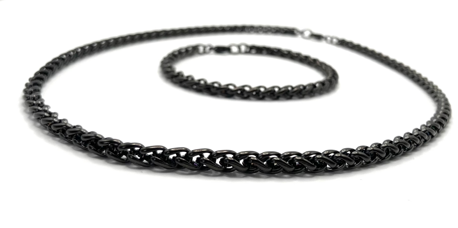 Collana e bracciale in acciaio inossidabile nero, catena intrecciata da 5mm, con chiusura a moschettone.