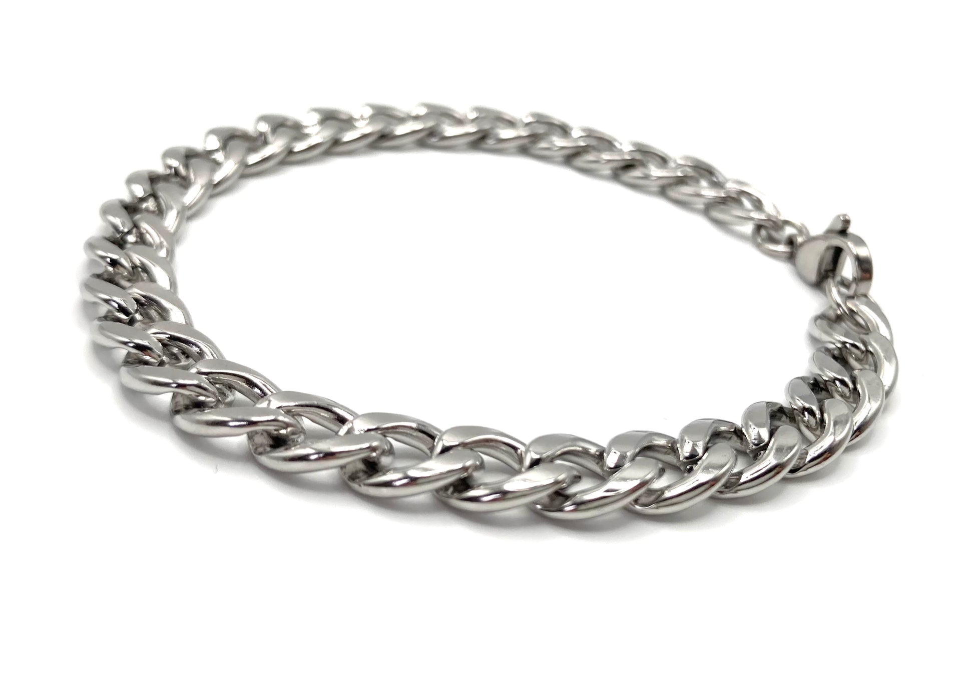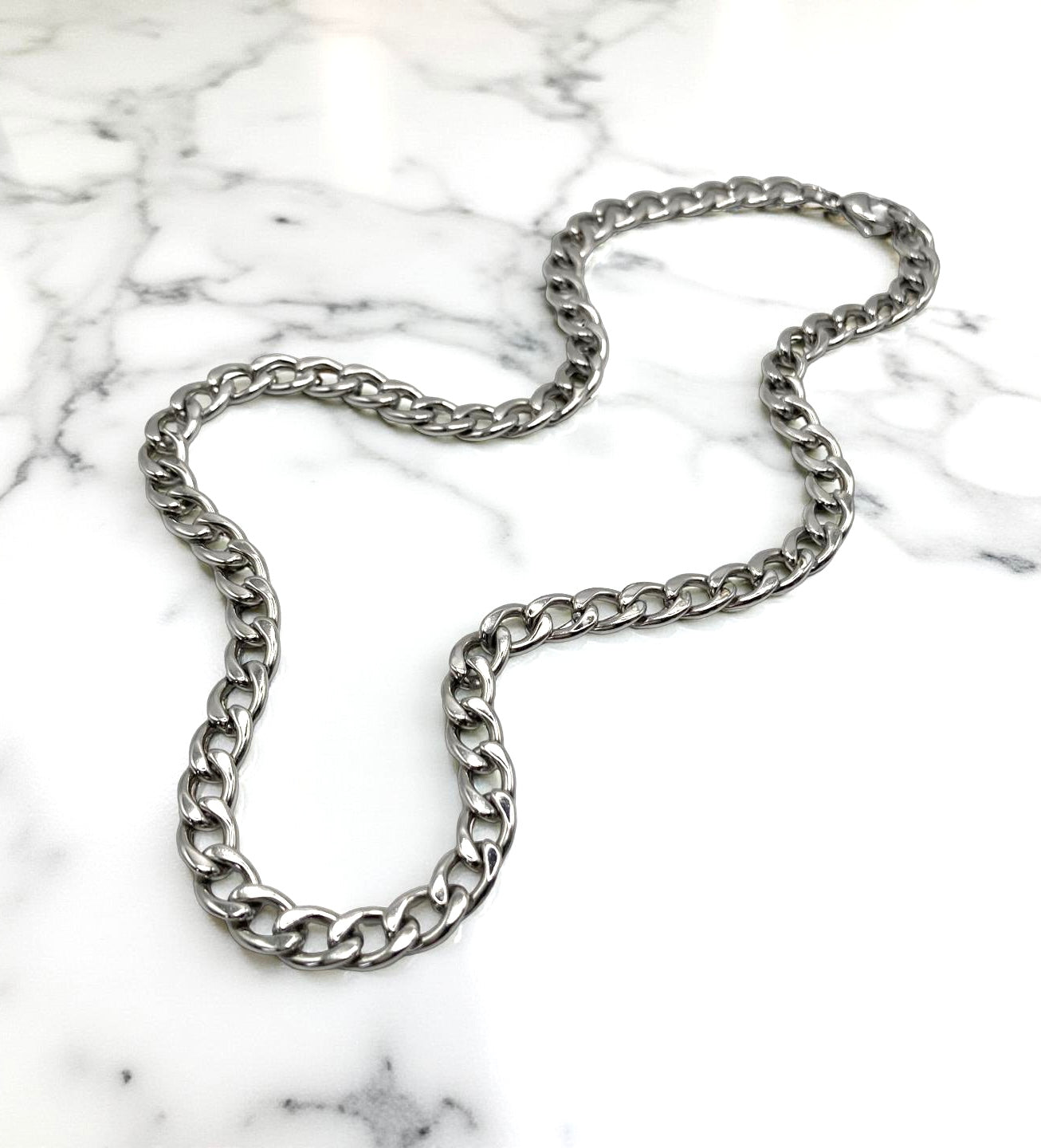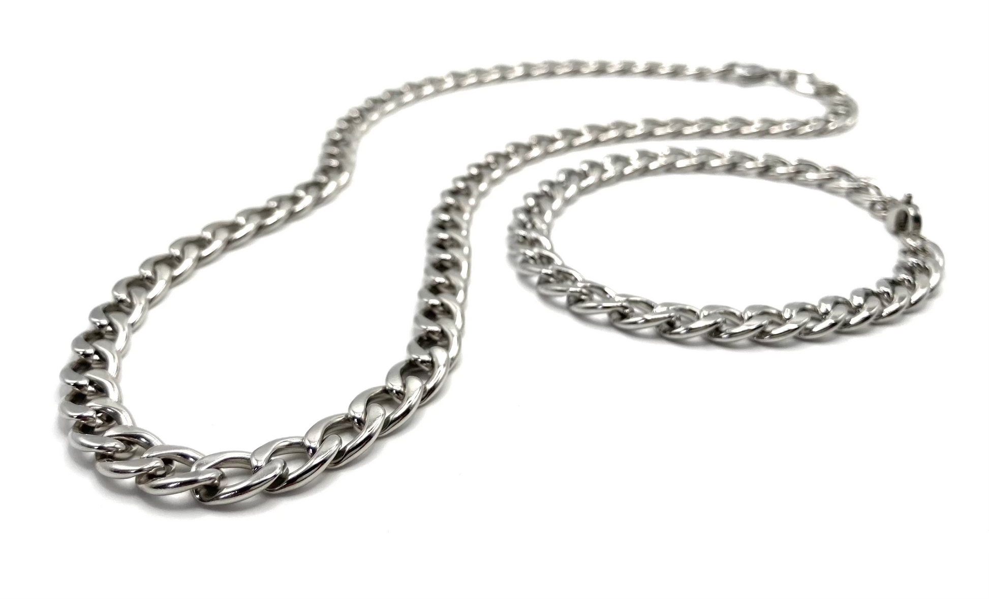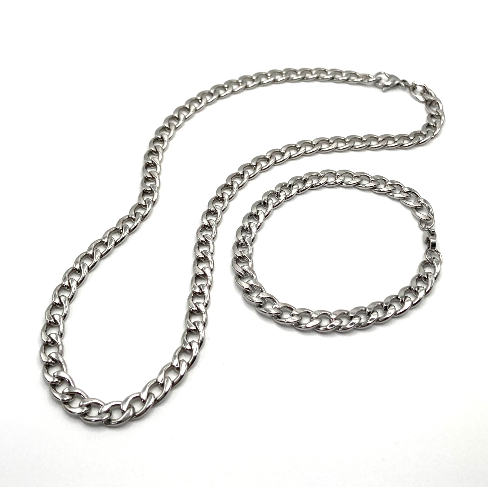 Collana e bracciale in acciaio inossidabile, catena a maglia piatta da 7.5mm, con chiusura a moschettone.