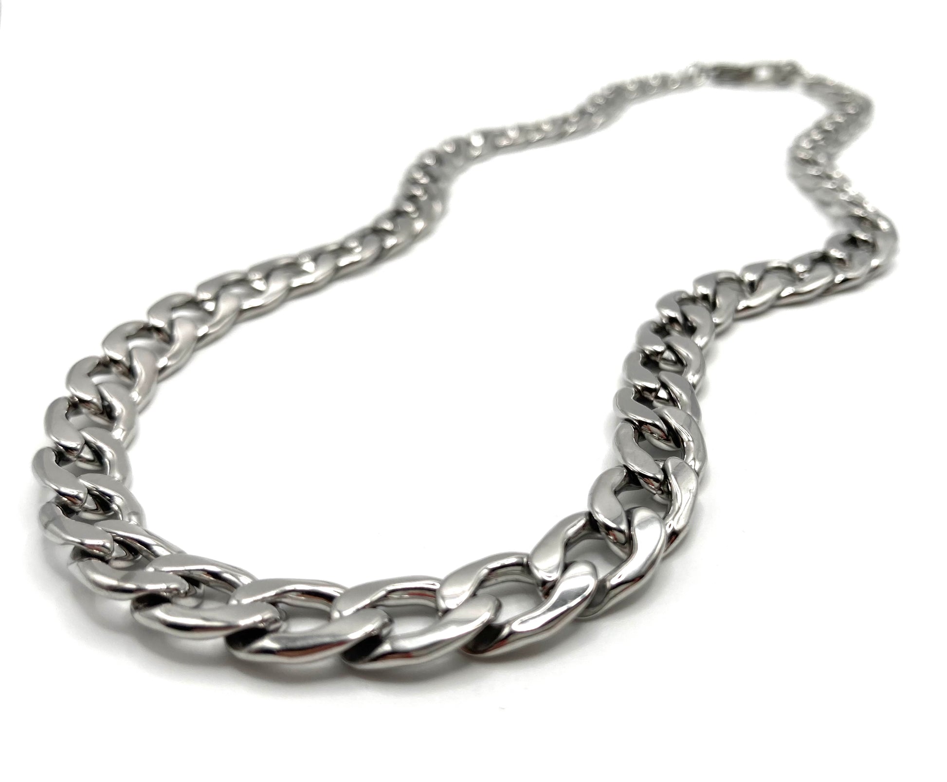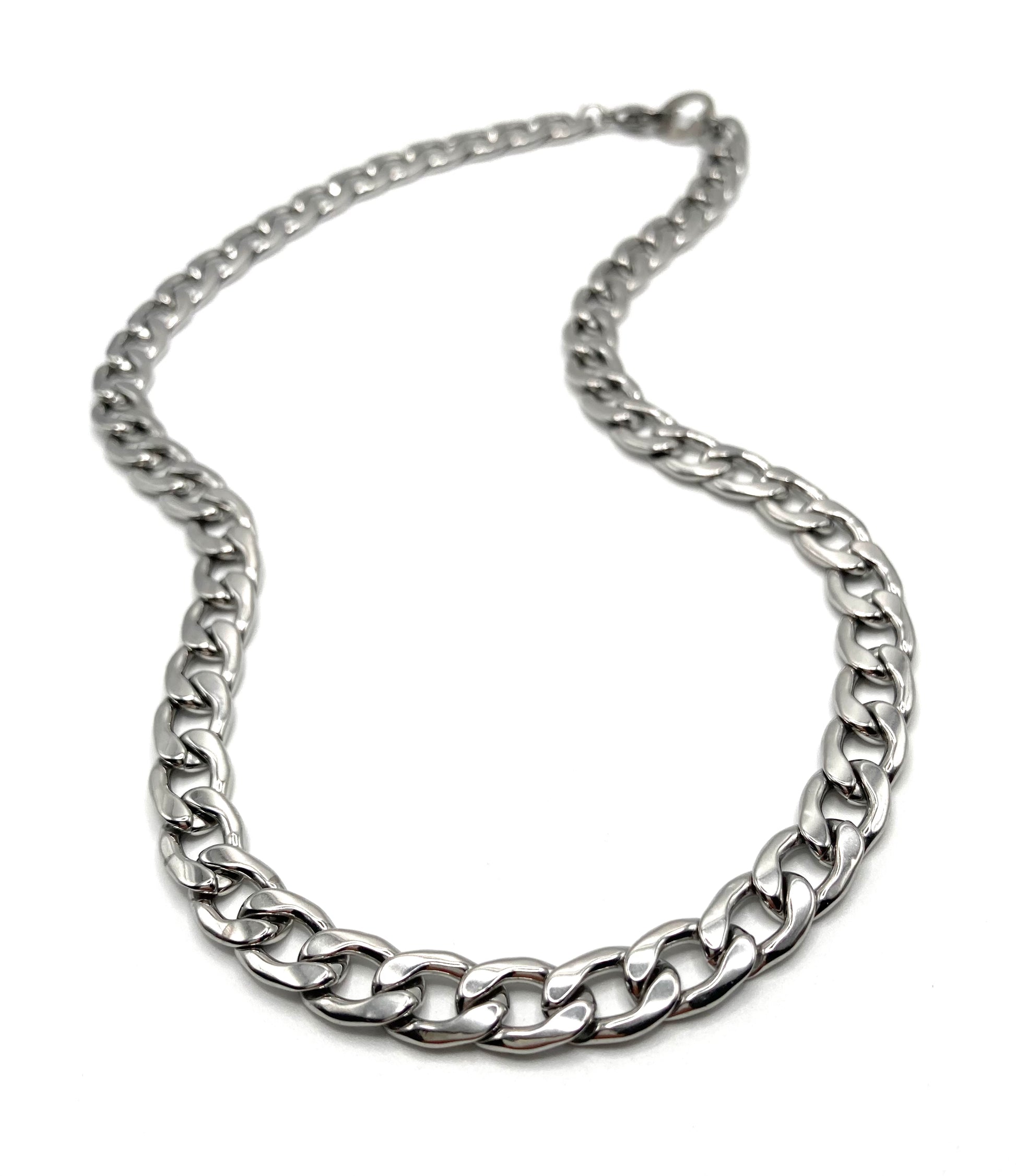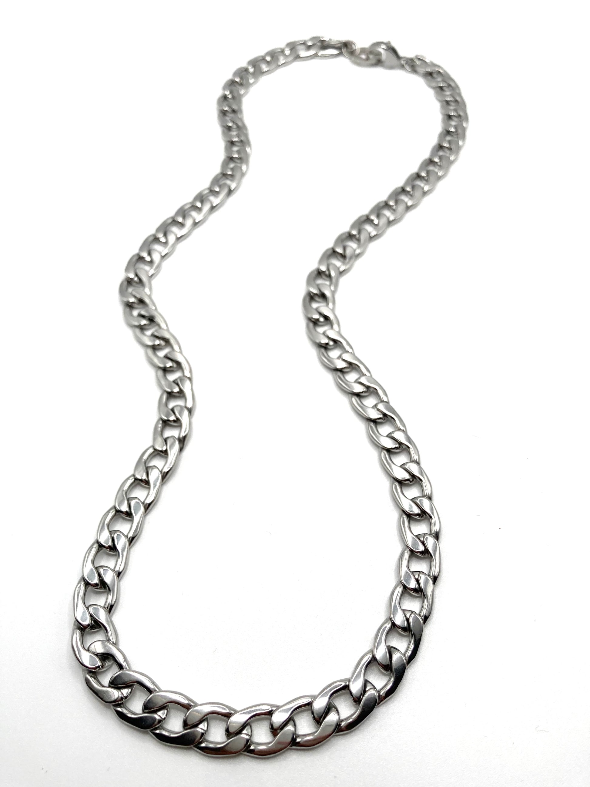Collana in acciaio inossidabile, catena a maglia piatta da 9.5mm, con chiusura a moschettone e logo "Quoreconlaq".