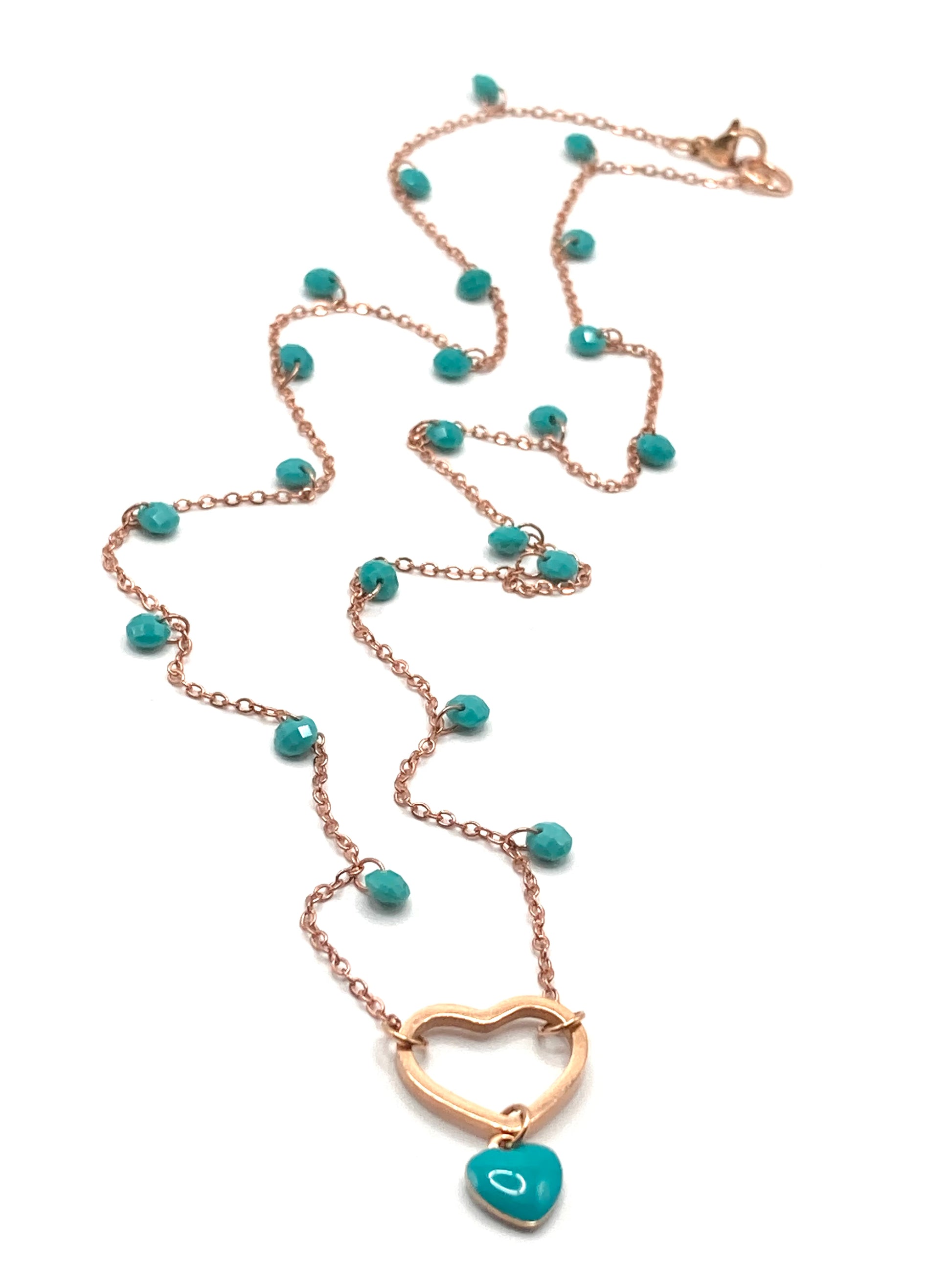 Set composto da : 1 Collana con catena in acciaio rosa con zirconi turchesi taglio brillante 4mm, connettore a cuore vuoto, con ciondolo a forma di cuore smaltato su base in acciaio rosa 7mm, 1 paio di orecchini a perno con cuore, catena in acciaio rosa con zirconi turchesi taglio brillante 4mm e ciondolo a forma di cuore smaltato su base in acciaio rosa 7mm