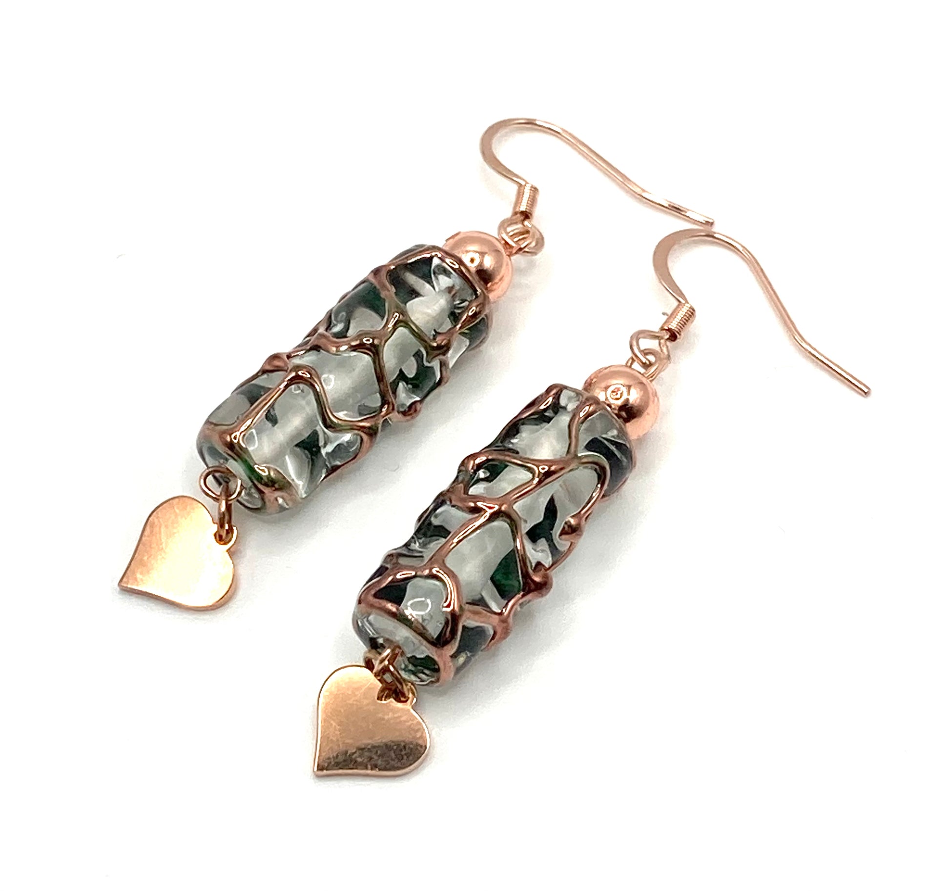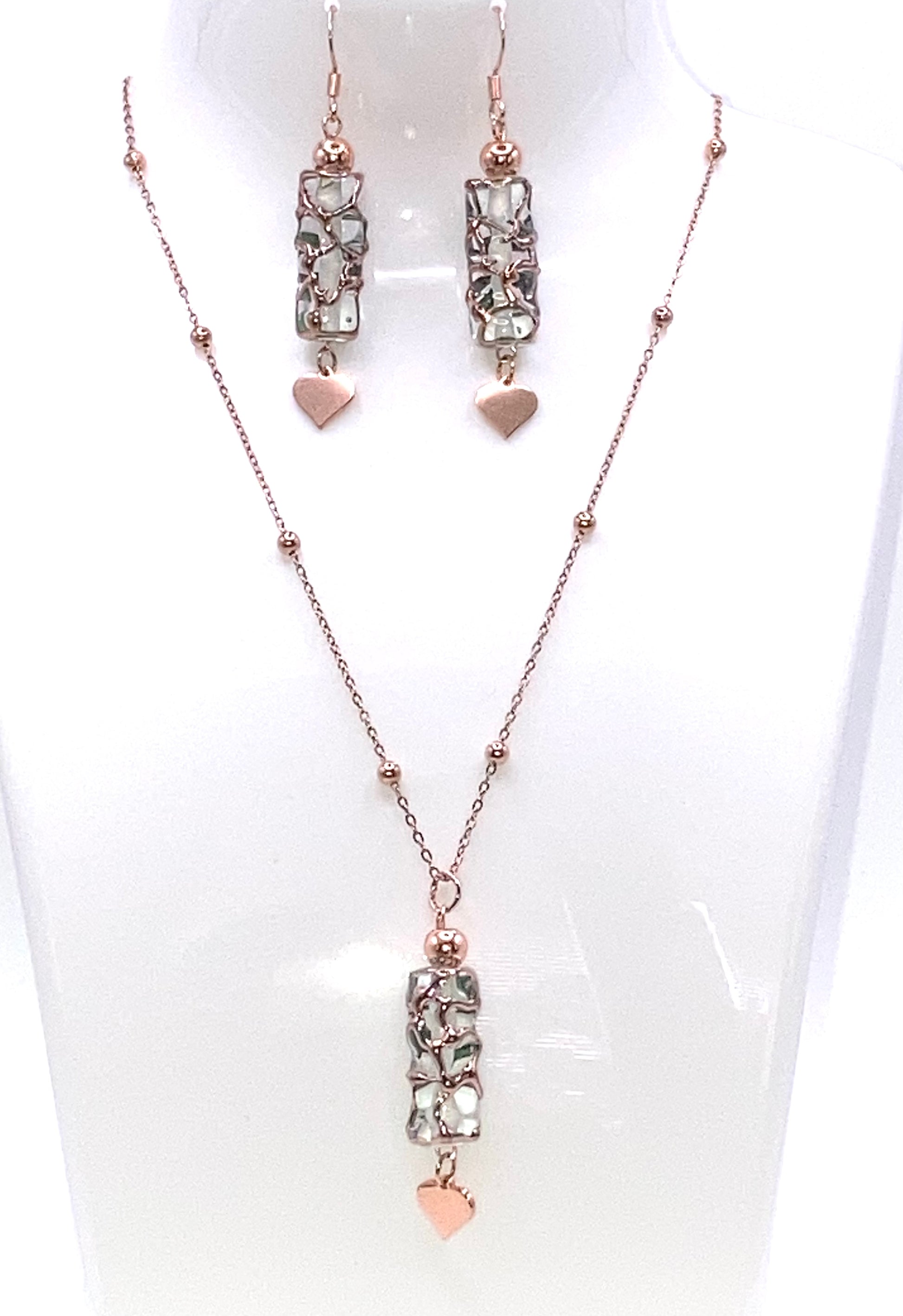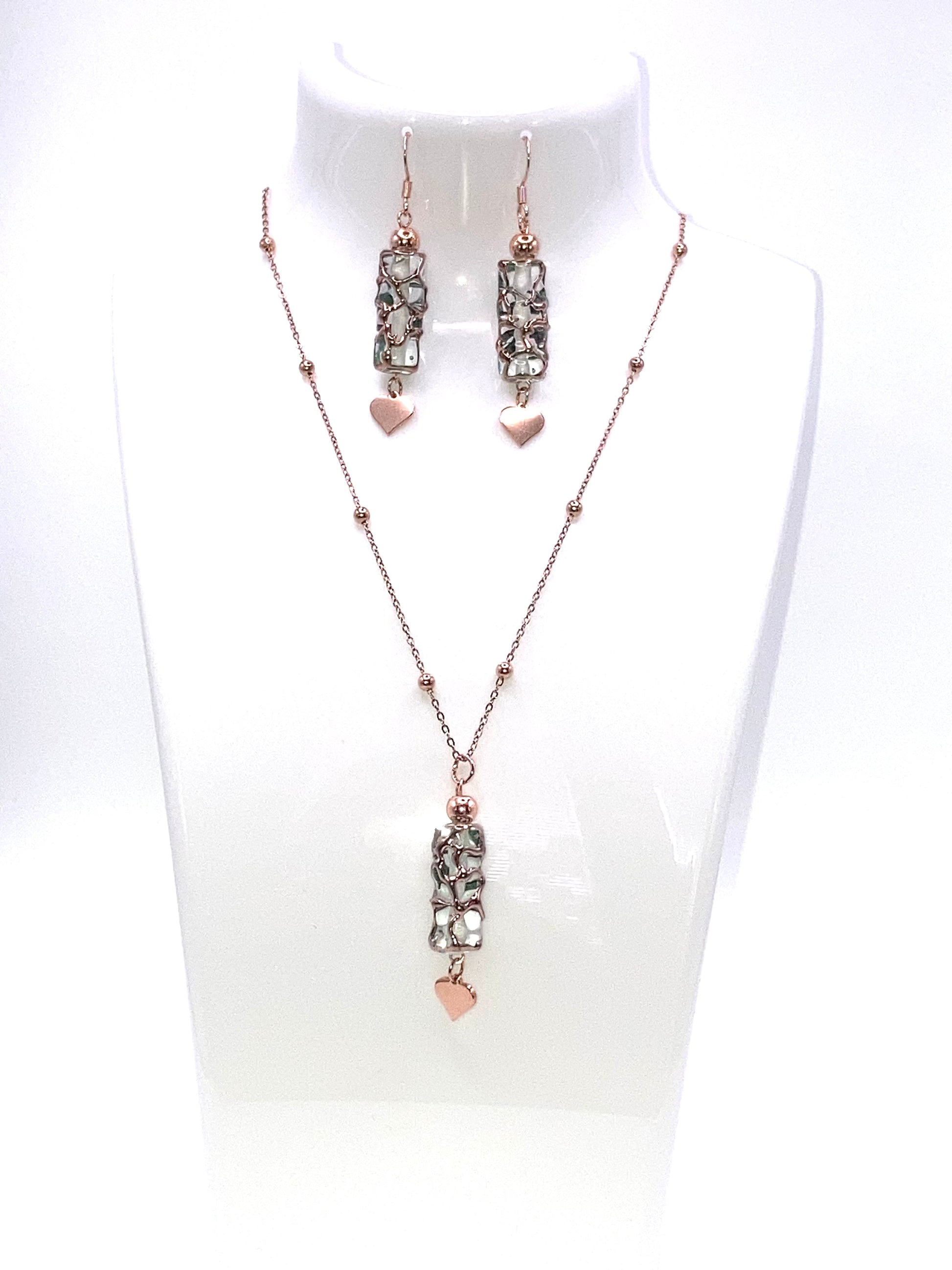Set composto da : 1 Collana con catena in acciaio rosa con palline 2mm, posizionate ogni 3cm, ciondolo a forma di tubo in vetro 20x8mm, perlina in ematite 5mm, cuore in acciaio 9mm, 1 paio di orecchini con monachella, tubo in vetro 20x8mm, perlina in ematite 5mm, cuore in acciaio 9mm
