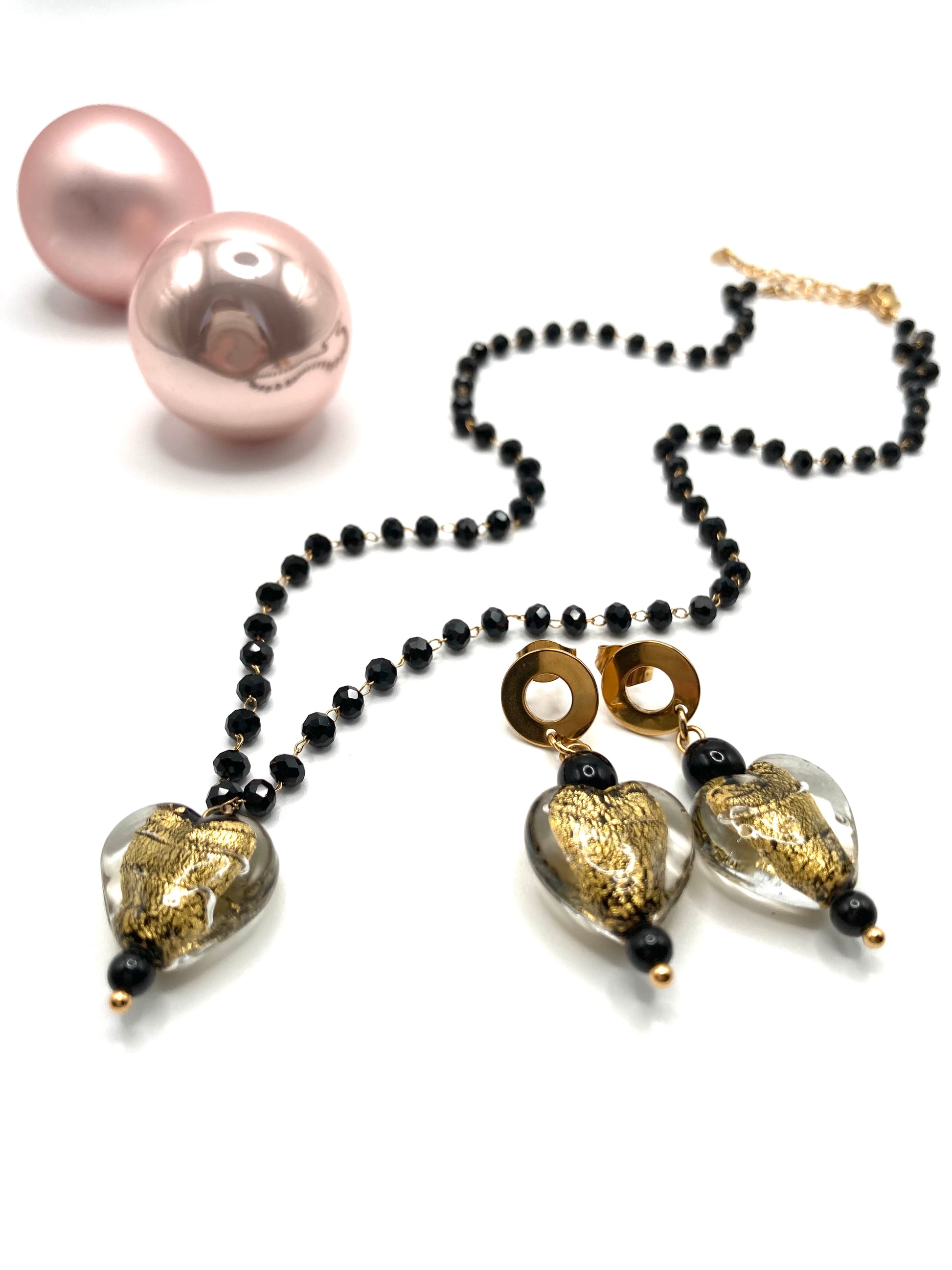 Set composto da : 1 Collana con catena rosario con cristalli da 2.5mm, charm centrale a forma di cuore in vetro foglia oro, 1 paio di orecchini a perno con cerchio 10mm, con pendente a cuore in vetro foglia oro.