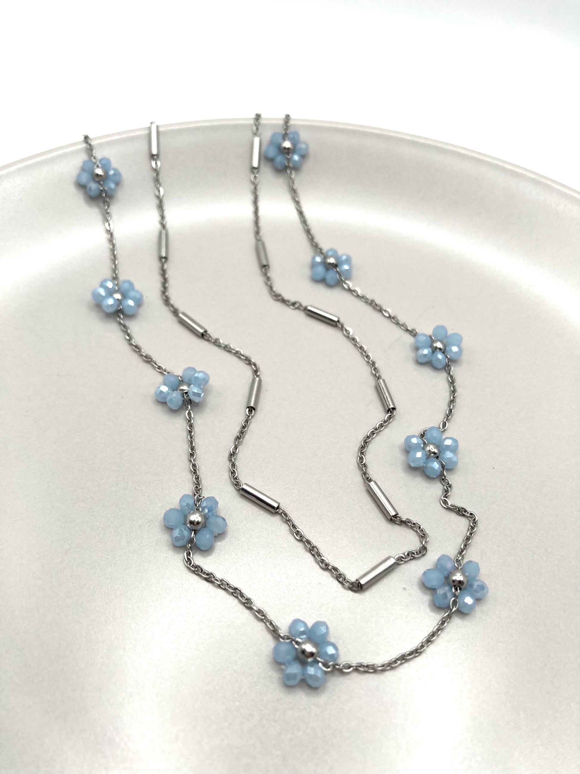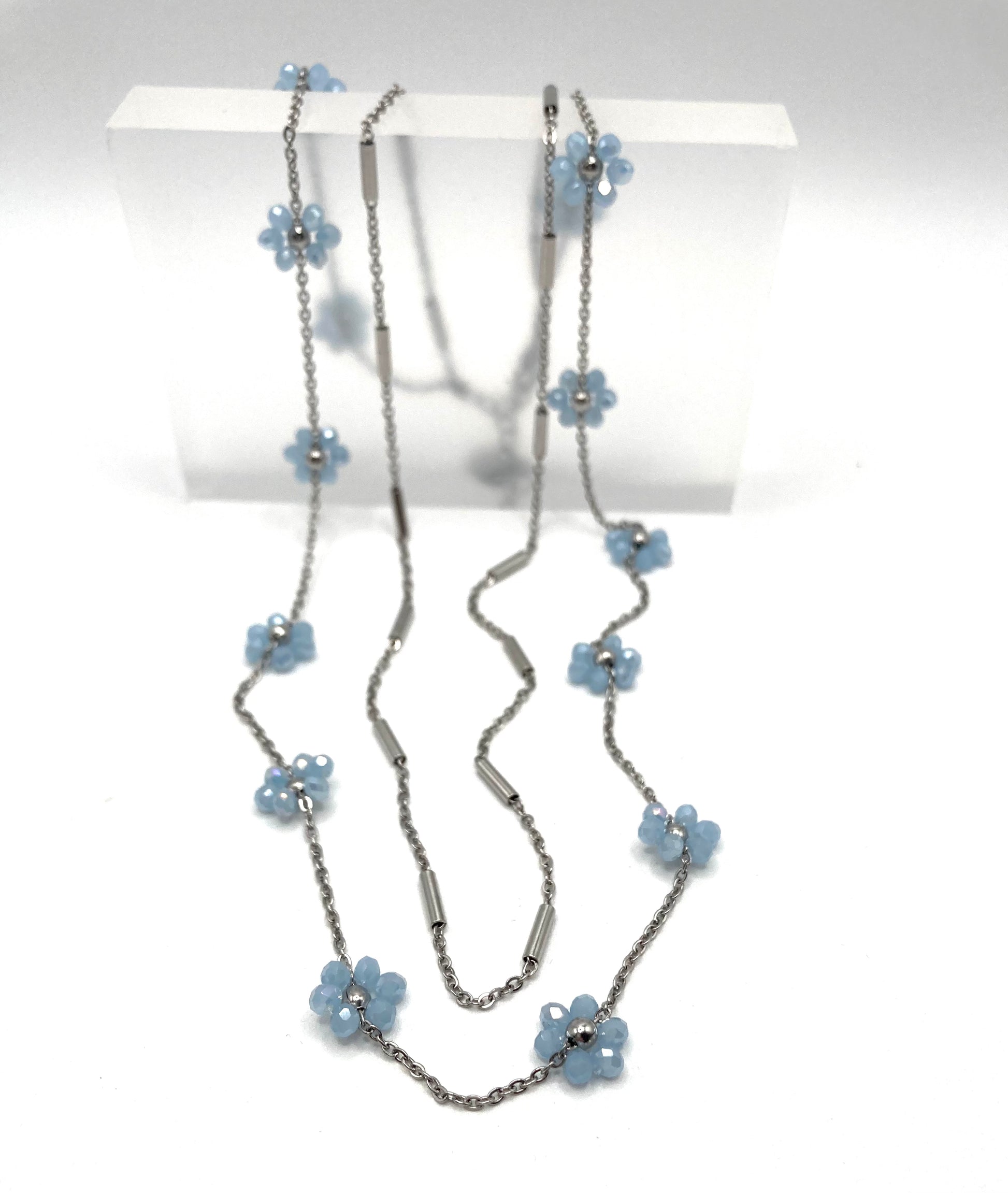 Collana in acciaio con catena a doppio giro: uno con ovalina e fiori in cristallo di 10mm posizionati ogni 25mm, l'altro con ovalina e tubi ogni 20mm. Regolabile con estensione per una vestibilità perfetta.