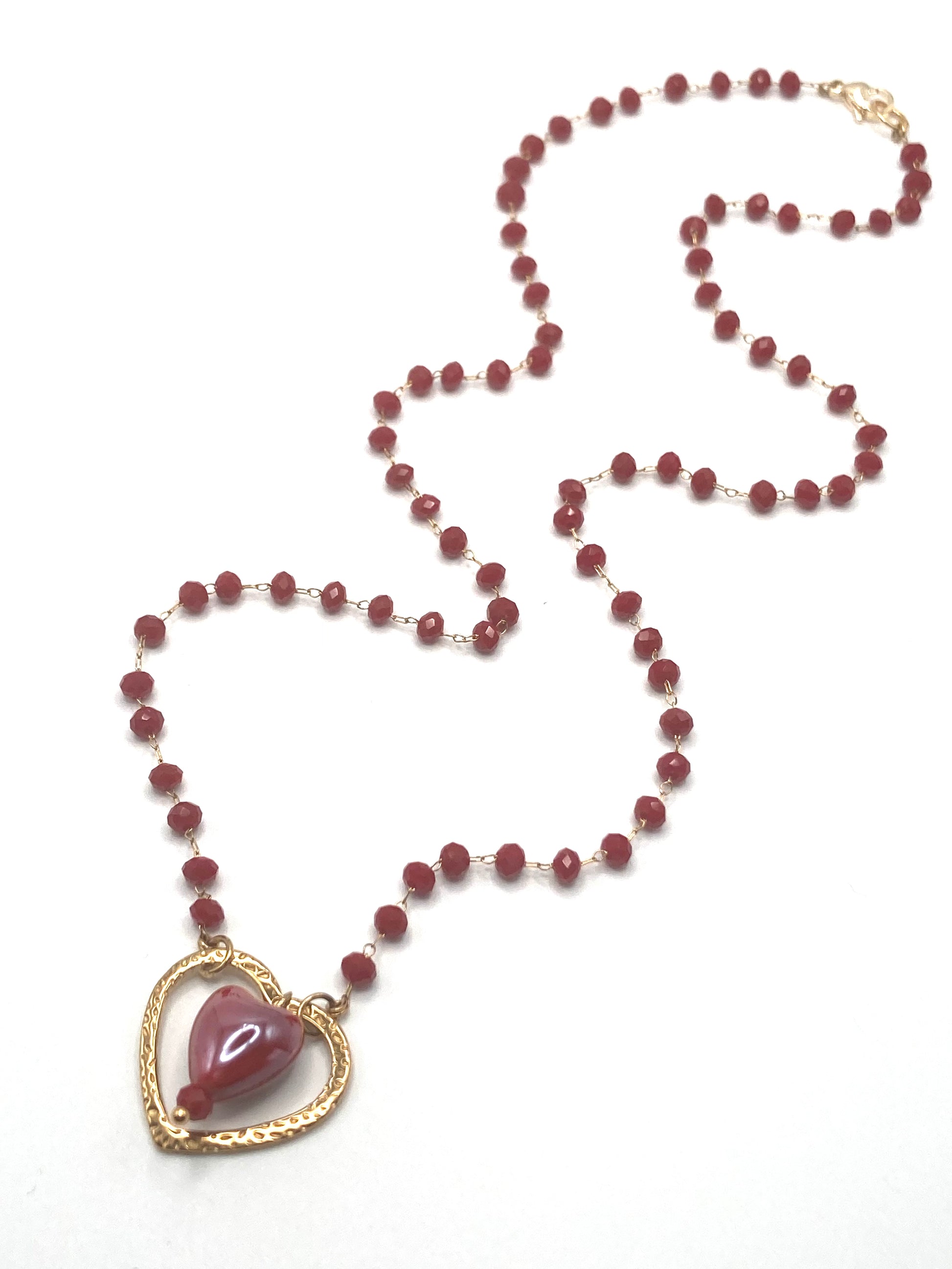 Collana in acciaio con catena rosario con cristalli da 3mm, connettore centrale a forma di cuore vuoto 24x20mm e all'interno un cuore in ceramica 12x13mm.