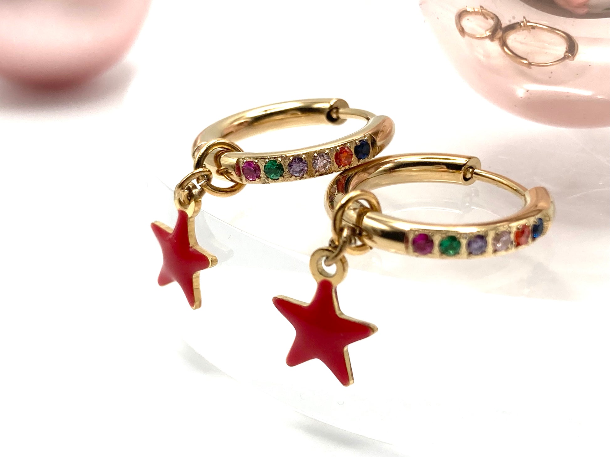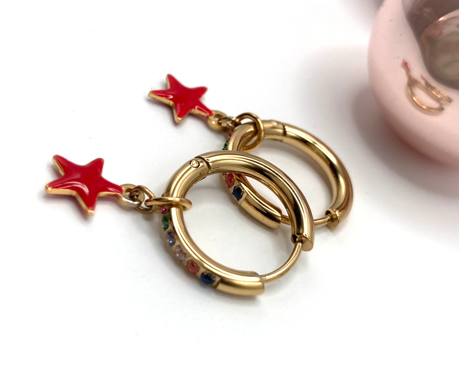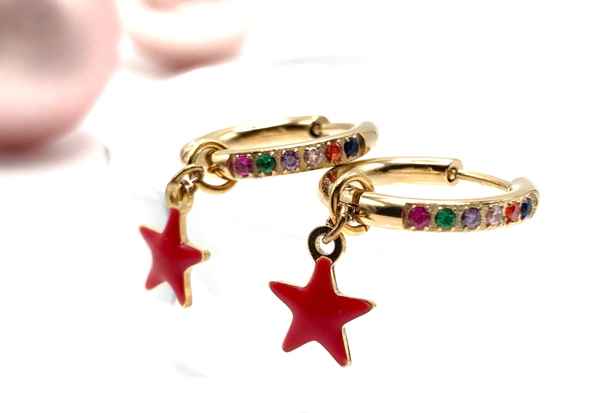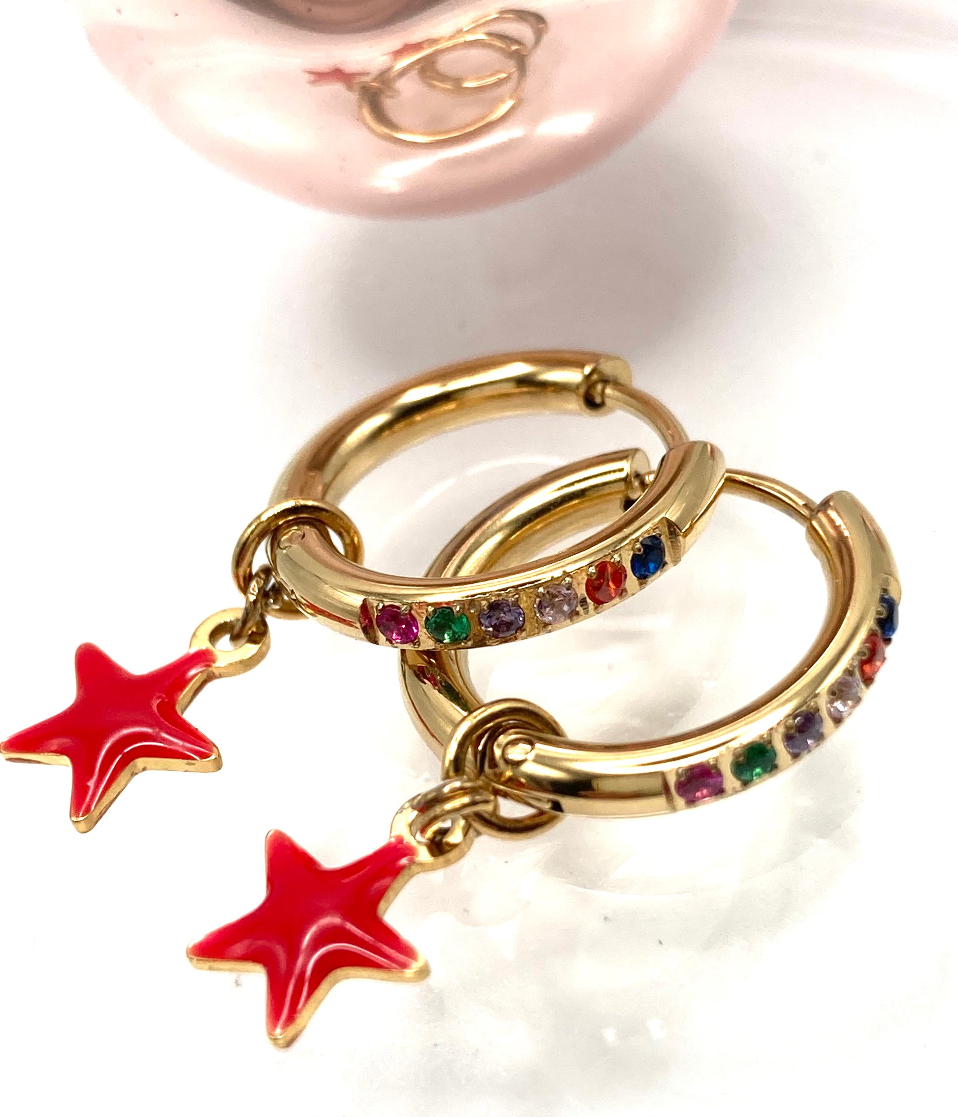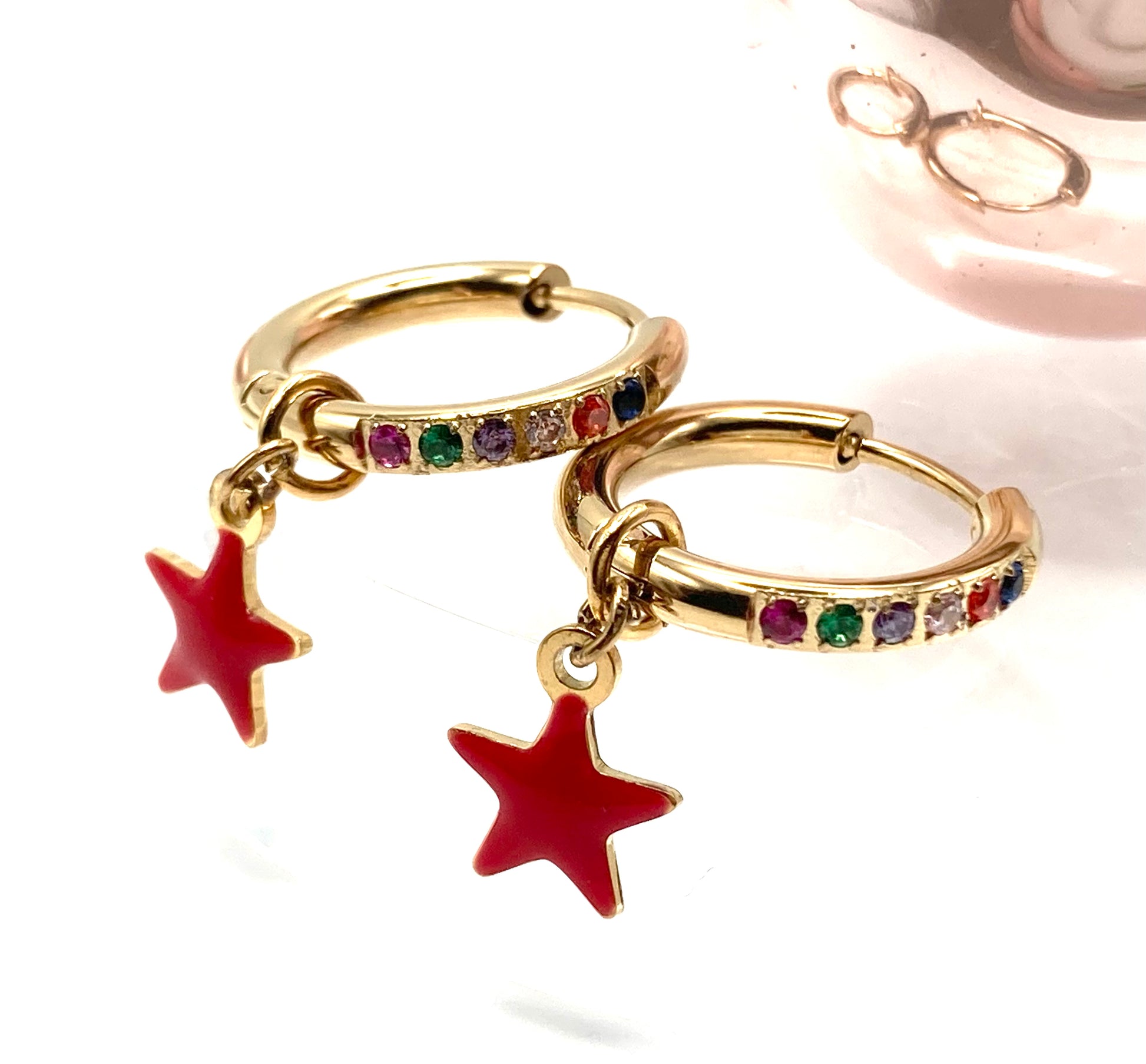 Orecchini a cerchio in acciaio diam.12mm, con zirconi multicolor e stellina smaltata 8mm.