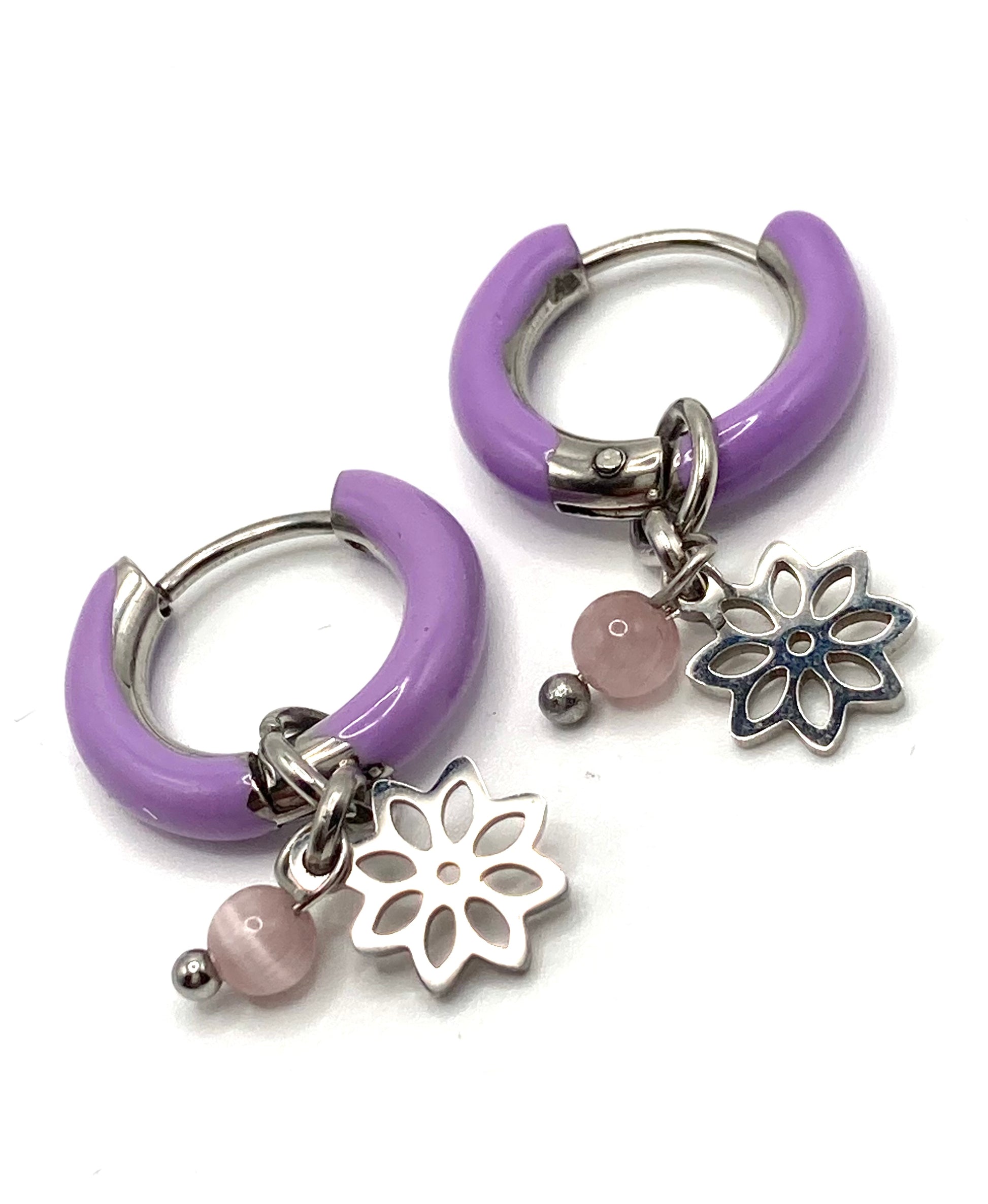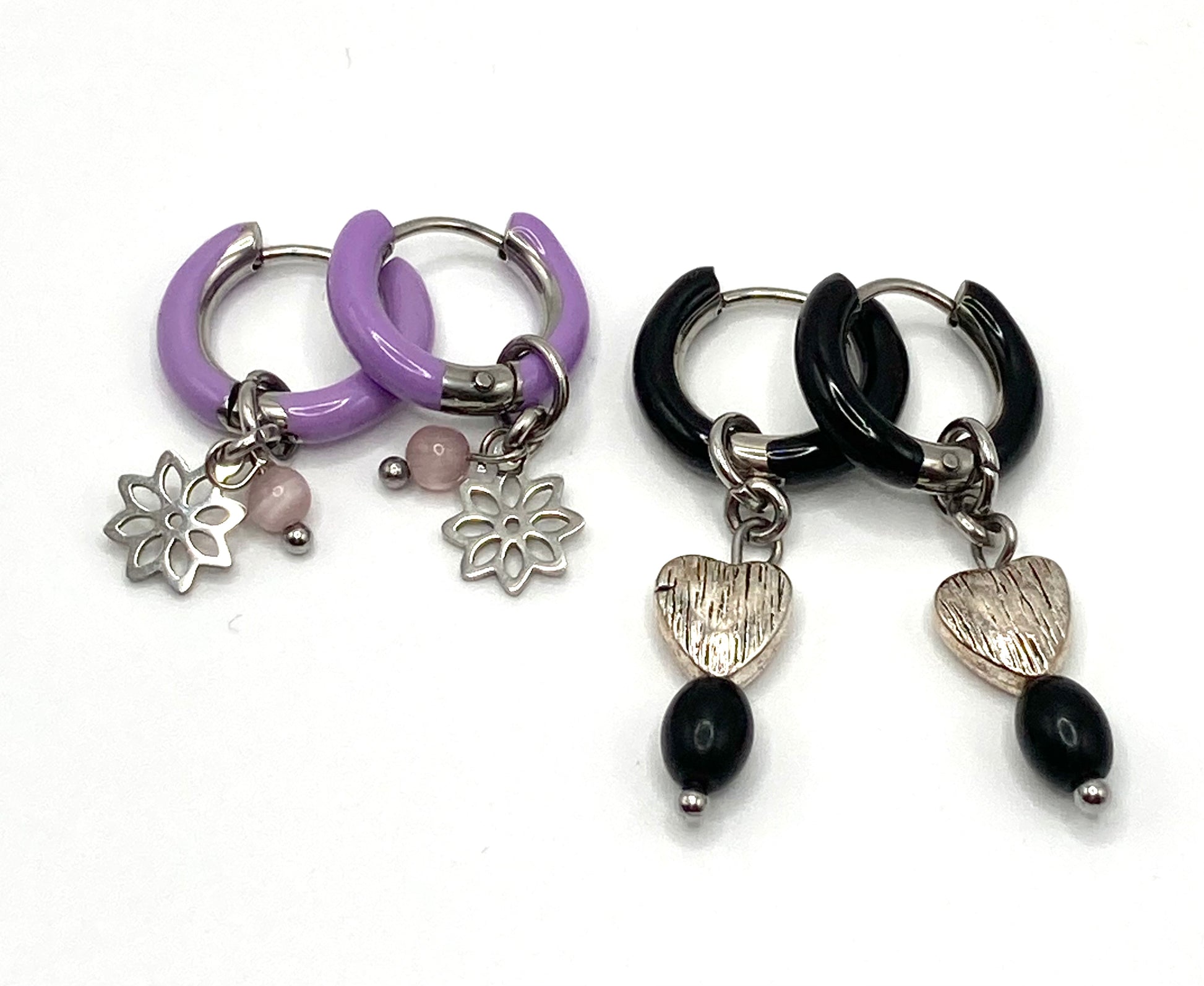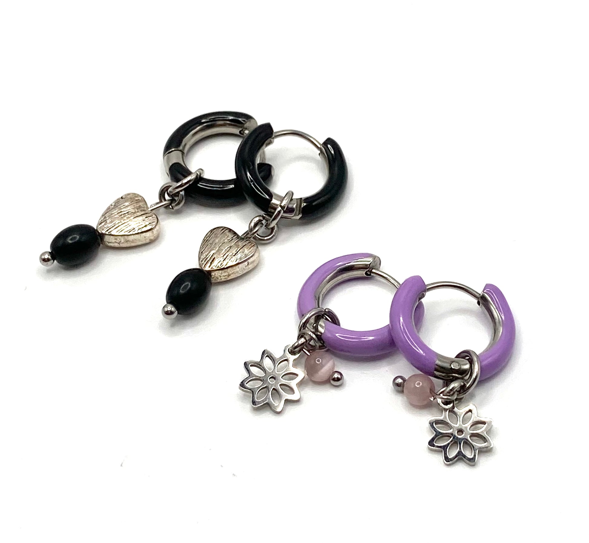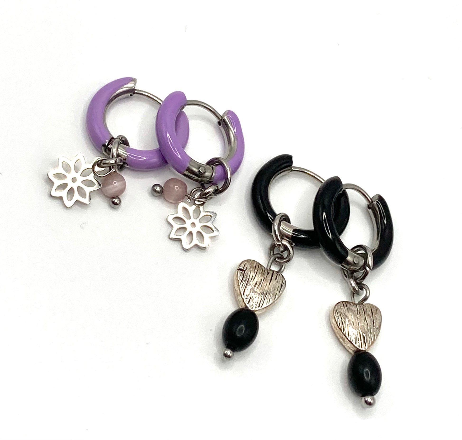 Orecchini a cerchio in acciaio smaltato Ø14mm, con charms in acciaio , chiusura scatto. La variante nera ha un cuore e un perlina ovale in vetro nero. La variante lilla ha un fiore e una perlina lilla in pietra dura.