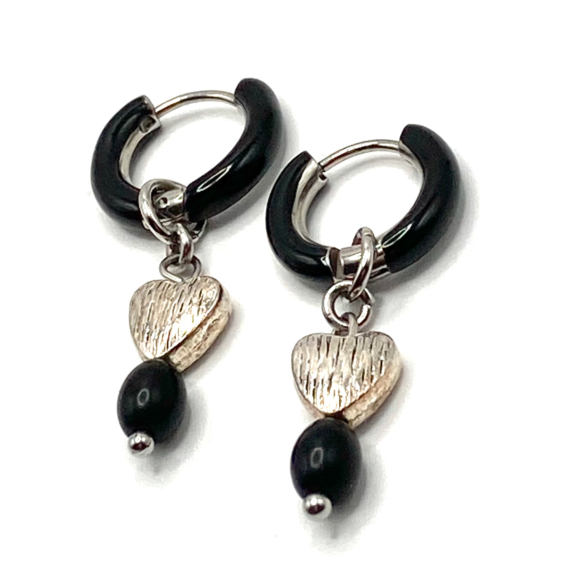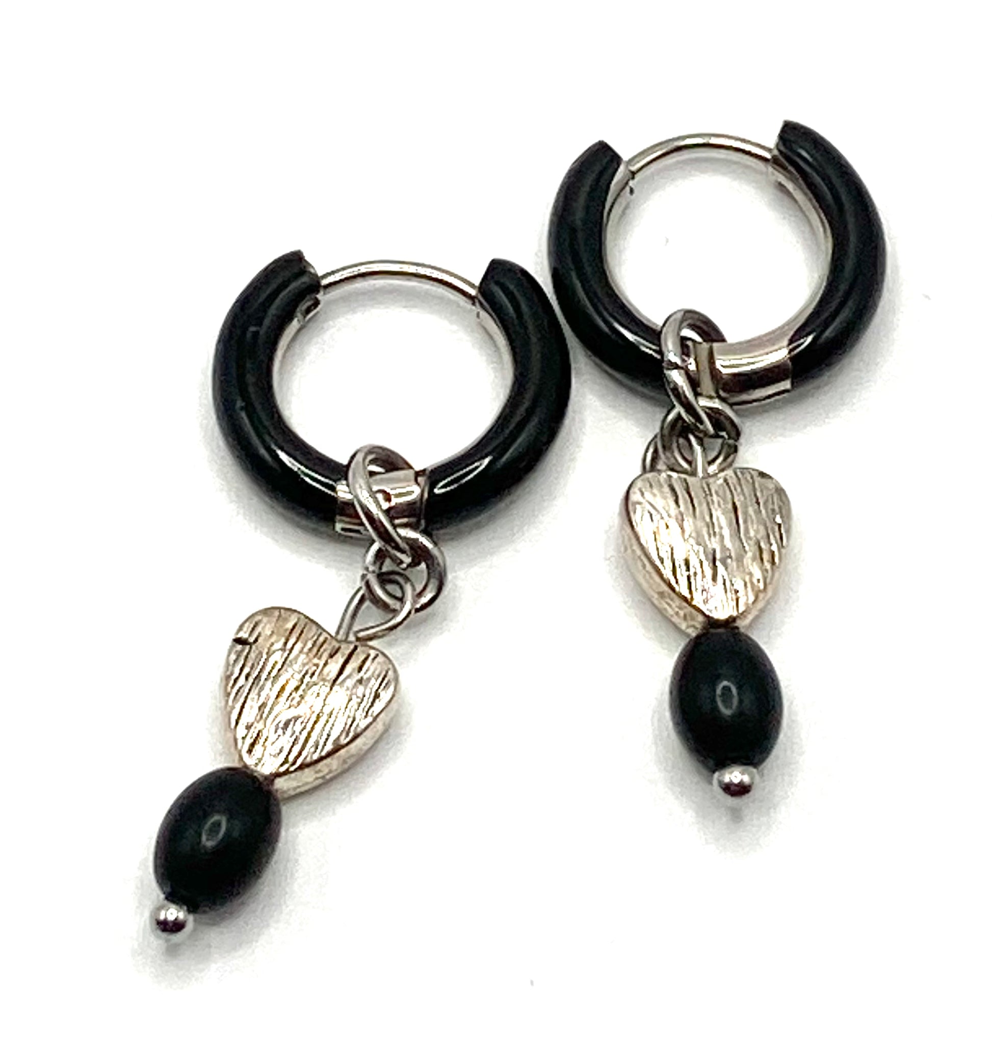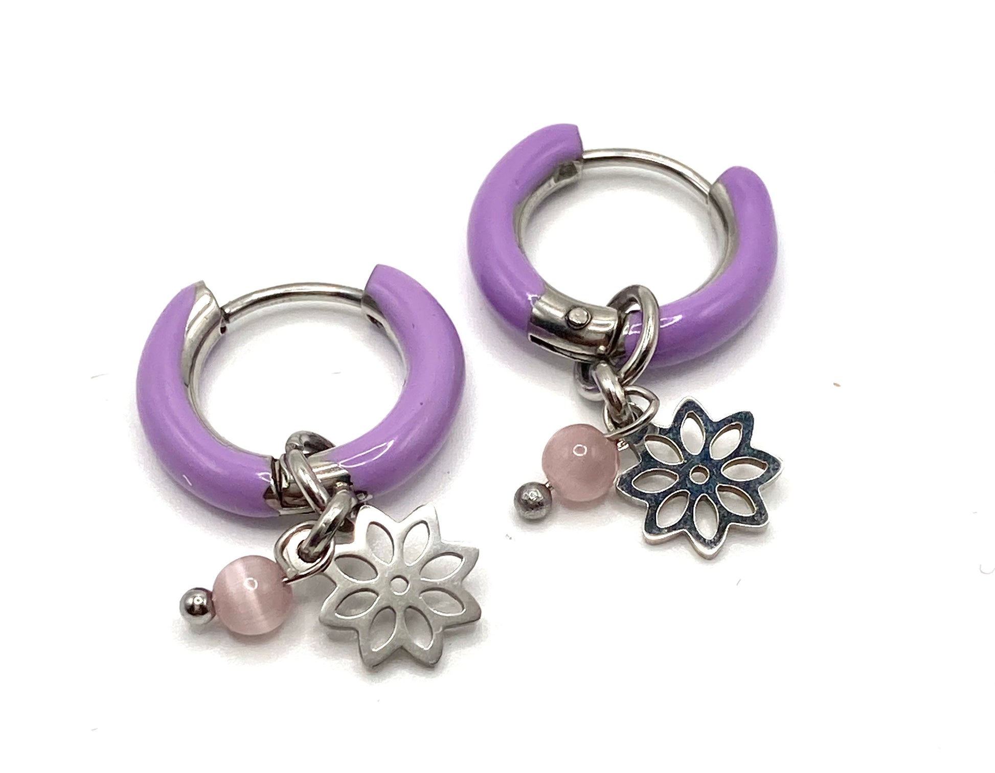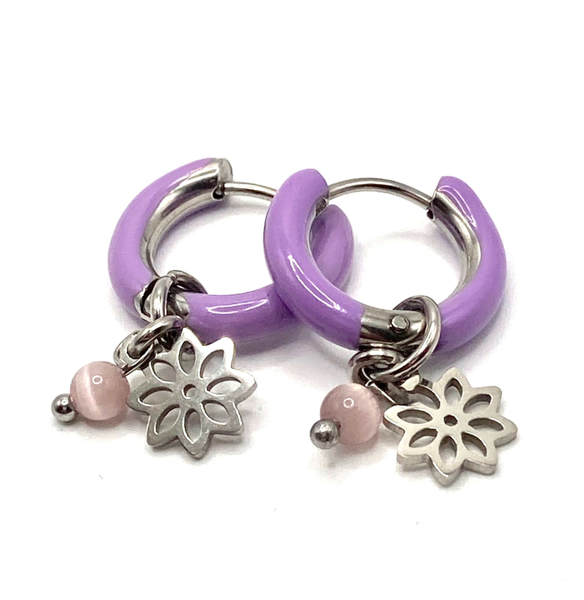Orecchini a cerchio in acciaio smaltato Ø14mm, con charms in acciaio , chiusura scatto. La variante nera ha un cuore e un perlina ovale in vetro nero. La variante lilla ha un fiore e una perlina lilla in pietra dura.