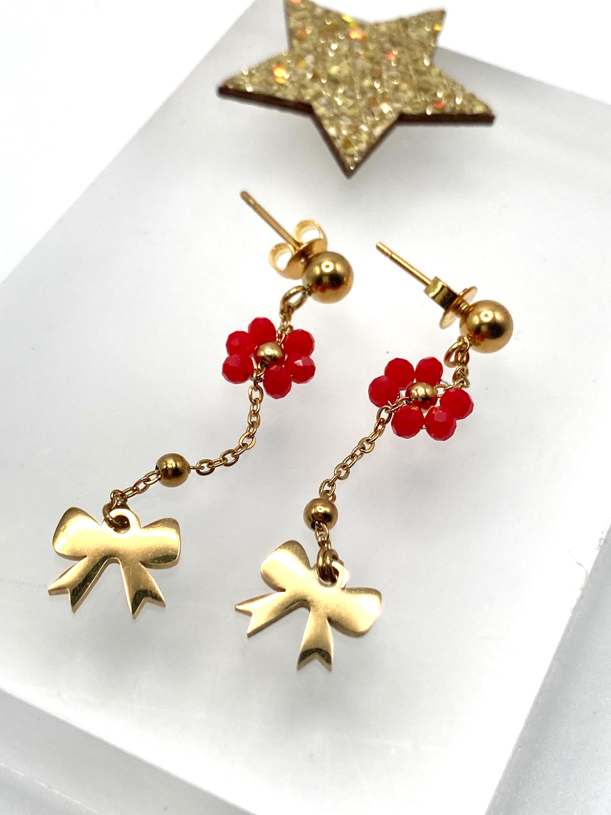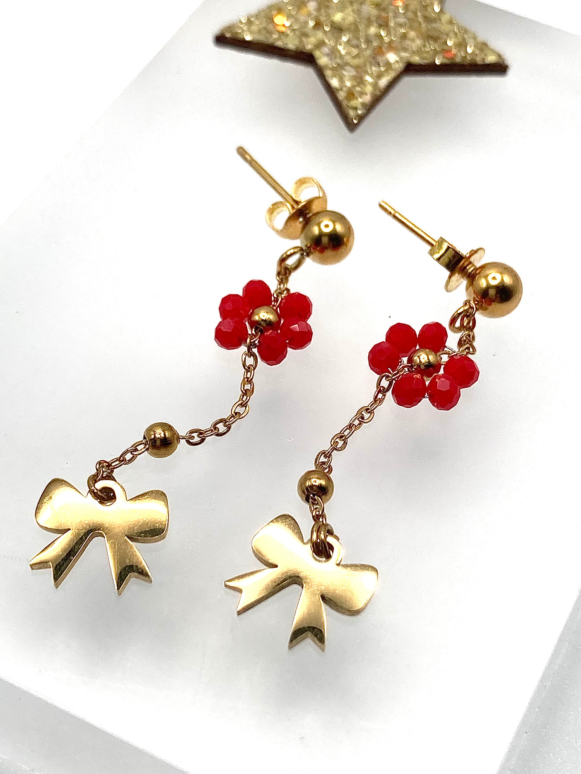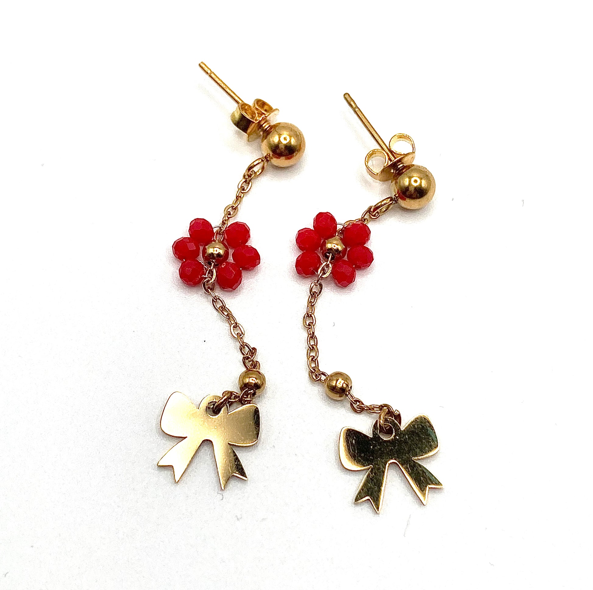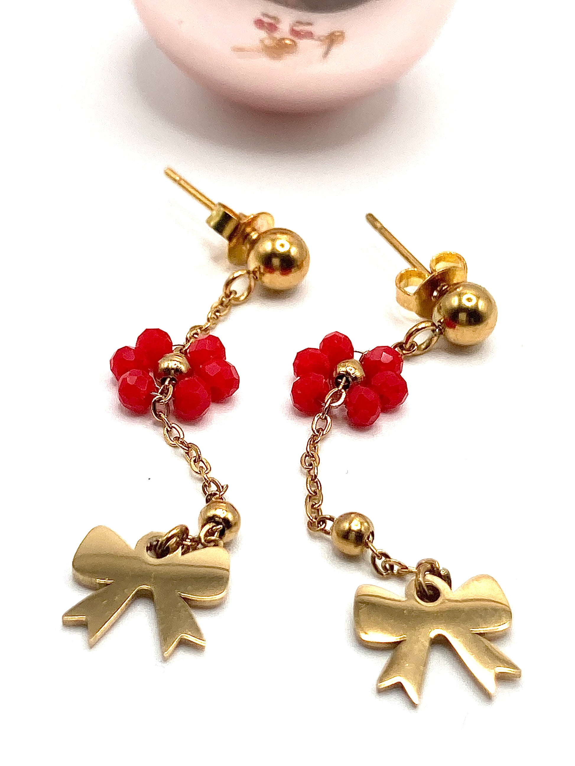 Orecchini a perno con pallina 4mm, pendente di catena con palline e fiori in cristallo di 10mm, charm a forma di fiocco 9.5x10mm