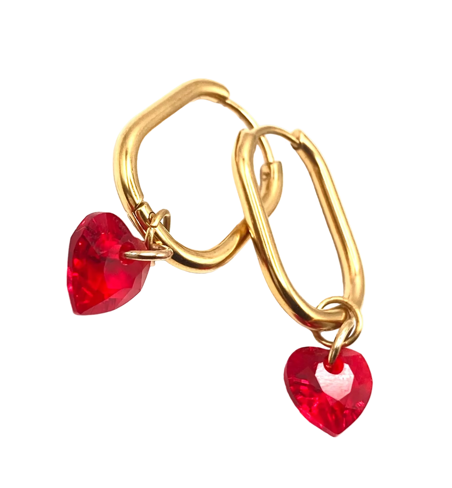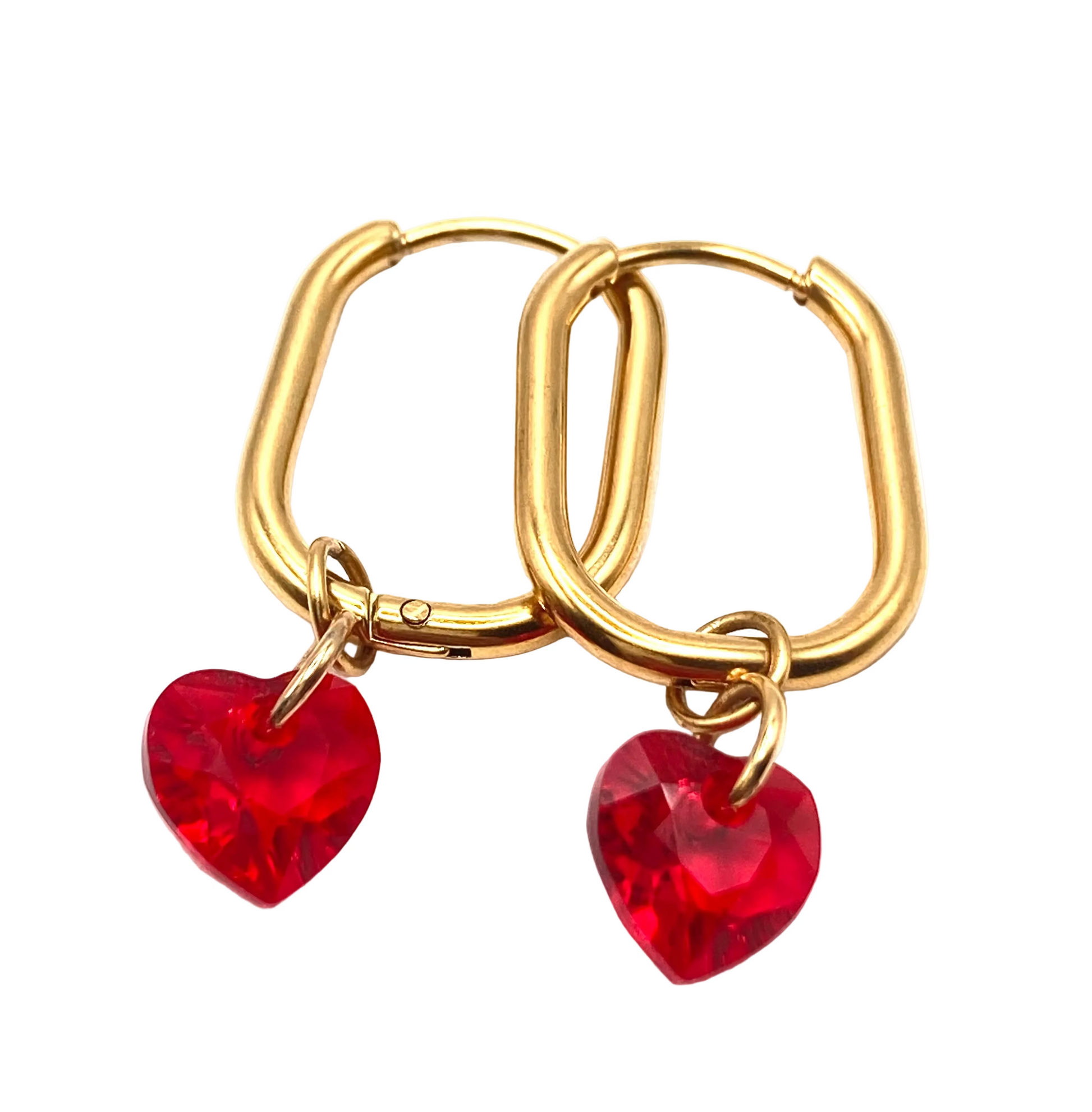 Orecchini a forma rettangolare in acciaio 20x15mm, con cuori in cristallo 8mm.