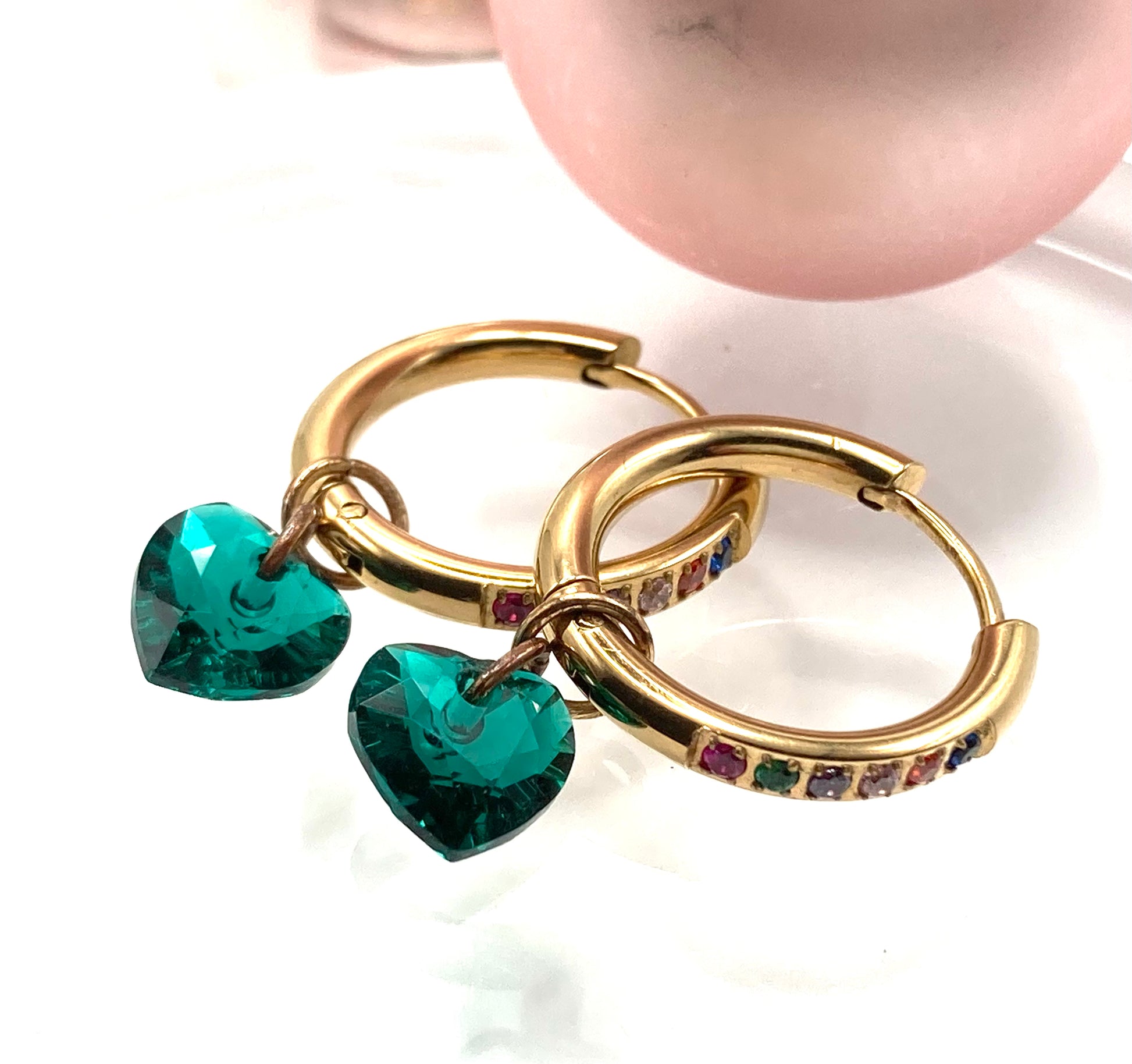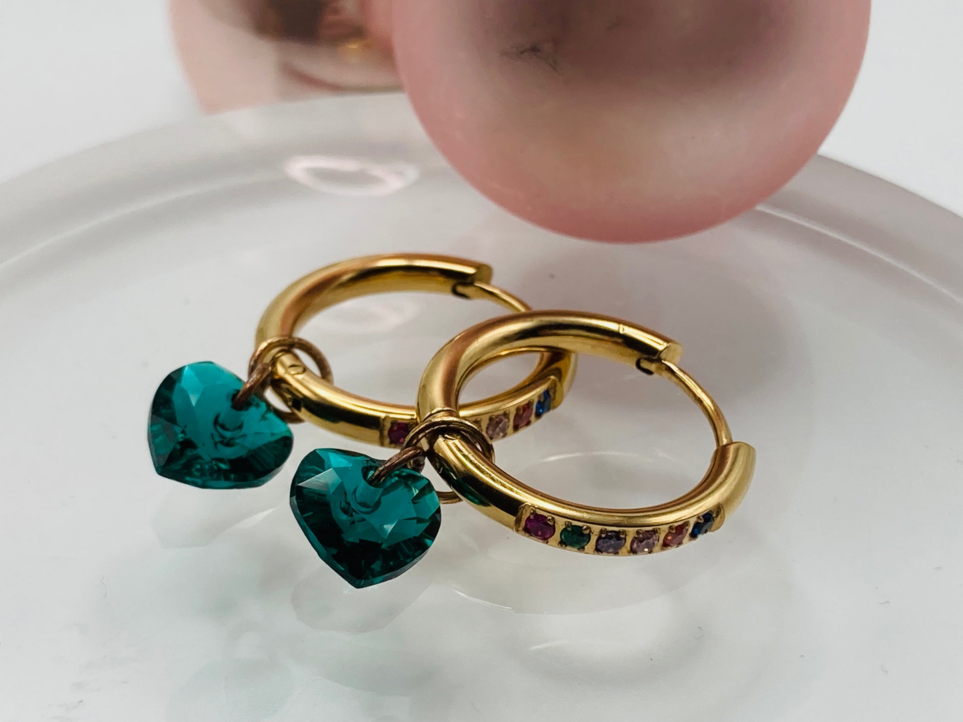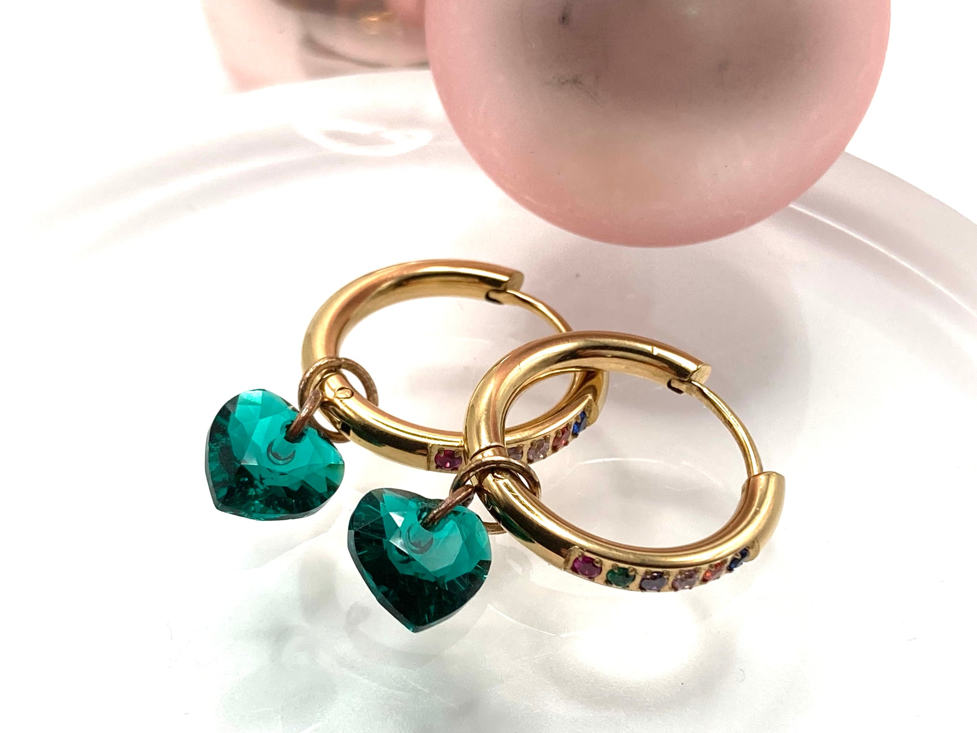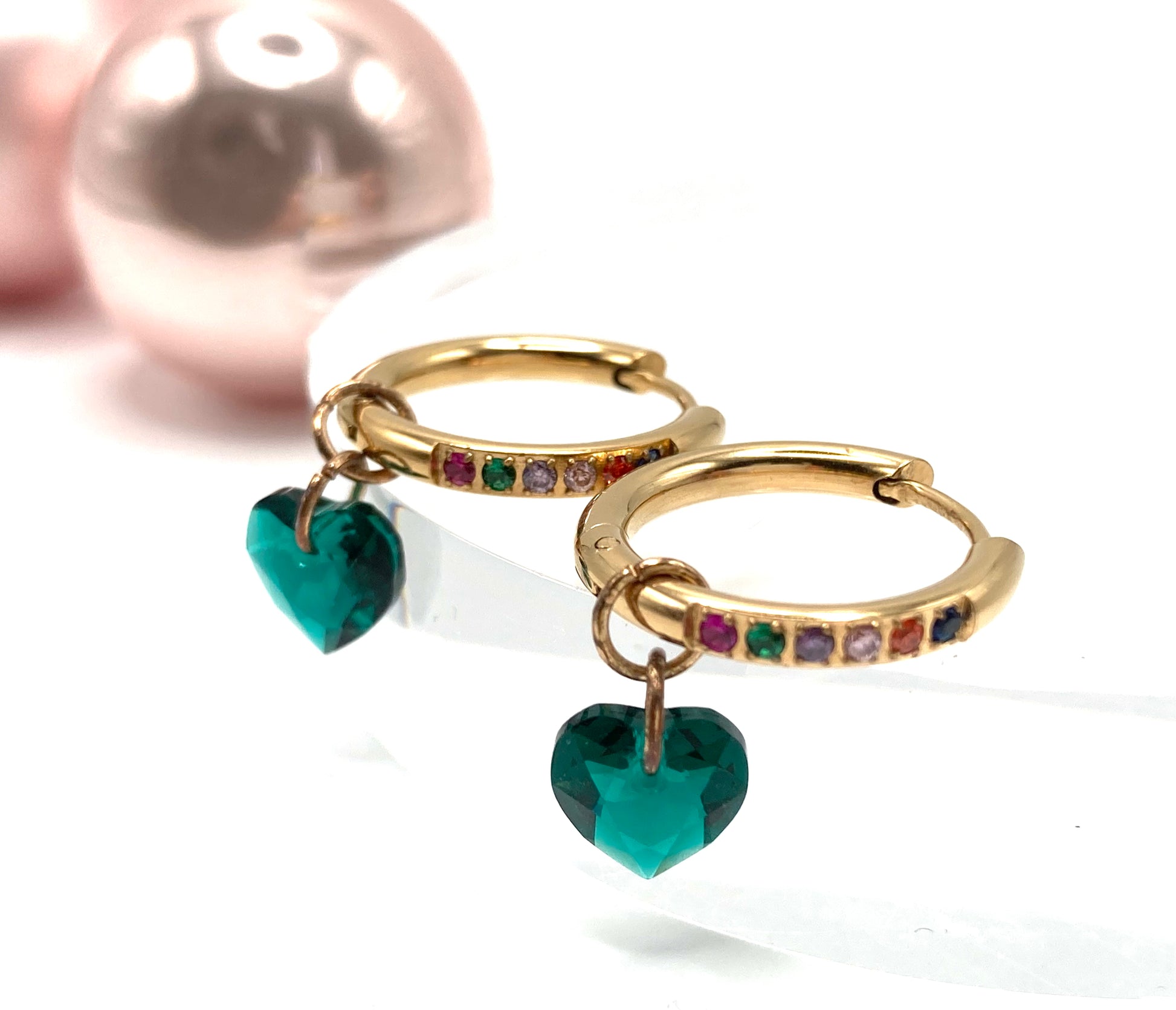 Orecchini a cerchio in acciaio diam.15mm, con zirconi multicolor e cuore in cristallo 8mm.