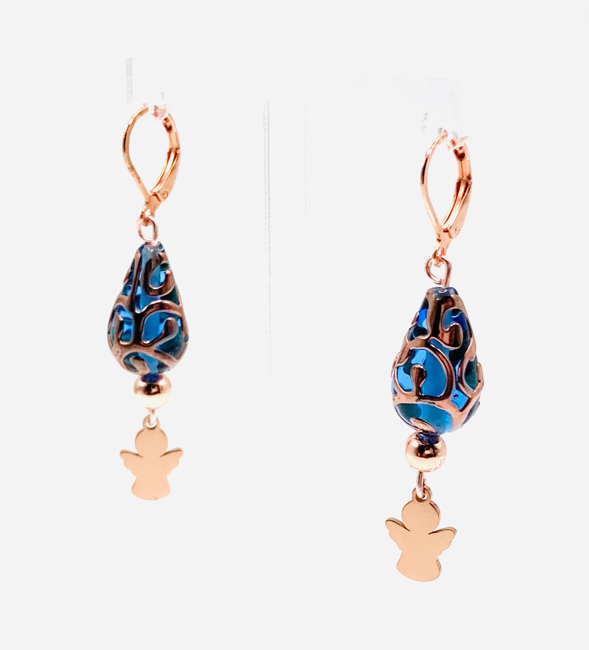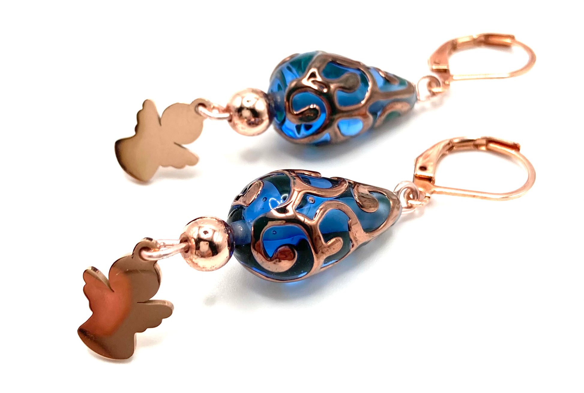 Orecchini con chiusura a scatto in acciaio rosa, perline ematite oro rosa 5mm, perla a goccia Lampwork in vetro 19mm e Angioletto.